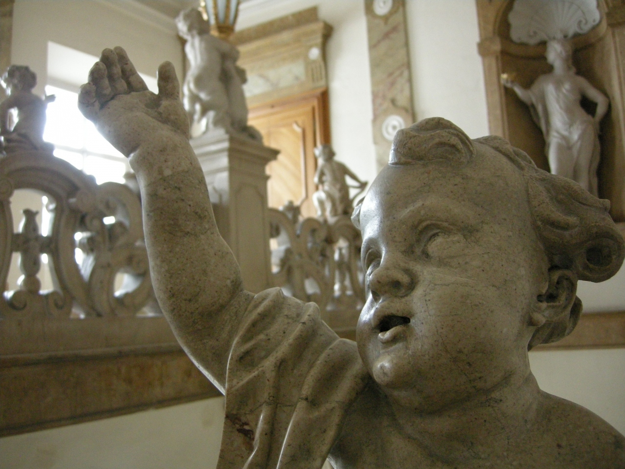 団体旅行でザルツブルクを訪れました。定番観光地のミラベル庭園で自由行動となりましたので庭園の奥のほうにあるペガサス像の方から宮殿の中に入りました。ここは天使の階段と大理石の間が見どころということでしたので楽しみにしていたのですが、残念ながら大理石の間はコンサートか何かの準備があったらしく閉鎖されていました。階段の方はたくさんの彫刻に装飾された派手なものでなかなか楽しめました。これだけでも見られて良かったと思います。
