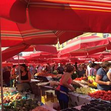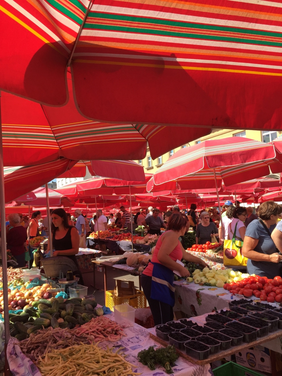 イェラチッチ広場の階段を登ると赤いパラソルの市場が広がっています。野外は野菜や果物がメイン、奥の屋内には生鮮系が売られています。夏場は少し蝿が気になりますが、市場が開いている時間帯に是非足を運んでください。