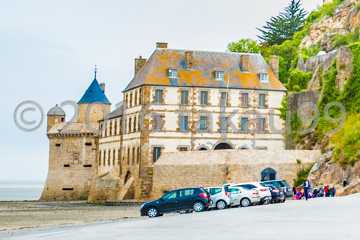 モンサンミッシェルの島の西側の建物です。駐車場から見れ左側です。アップの写真で一見するとヨーロッパの普通の歴史ある建物にしか見えませんが、島全体を俯瞰してみると大事な防衛ラインであることが良くわかりました。