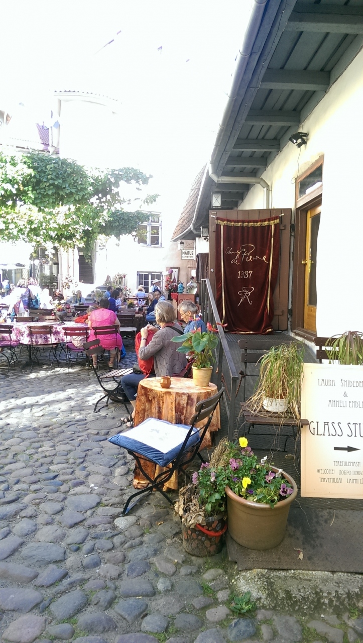通り沿いにあるのではなく、少し袋小路になっているスペースに入っていくと、中庭いっぱいにオープンスペースのカフェが展開しています。なかはケーキのショーケースがありますが、7月のよい時期でもあり皆さん外でチョコドリンクを楽しんでいました。このカフェは老舗ですが、周囲はクラフト、帽子、アクセサリーなどいろんな職人さんのショップが展開して楽しいところです。