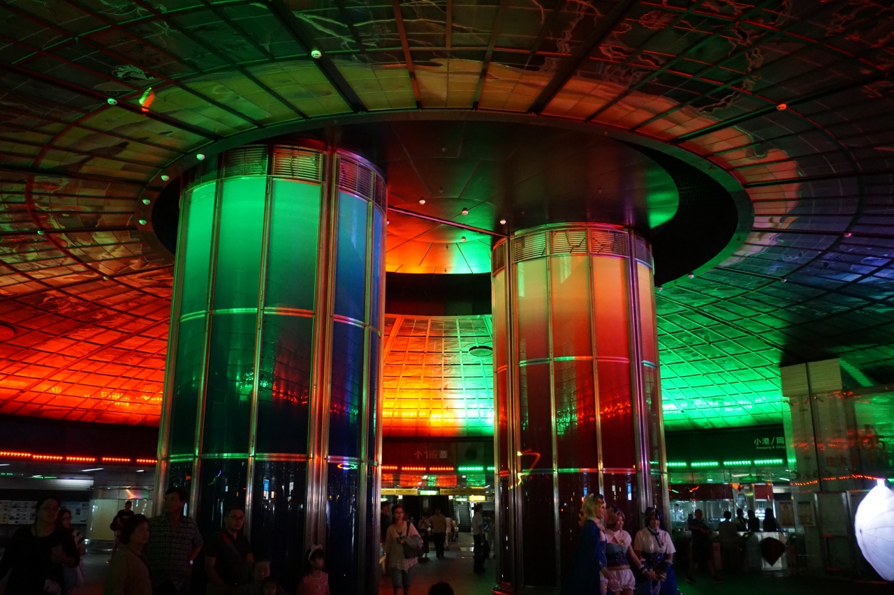 高雄のMRT駅、美麗島の改札前にあります。常に観光客が色々な角度から写真を撮っています。一応、ここからが一番美しいといわれる場所の床に印がついていました。光のショーの時間帯は地元の方も集まって来て楽しんでいるようでした。時間にして15分くらい。私は近い時間帯に通りかかったので見ましたが、わざわざこのためにスケジュールを組むほどでもないと思います。