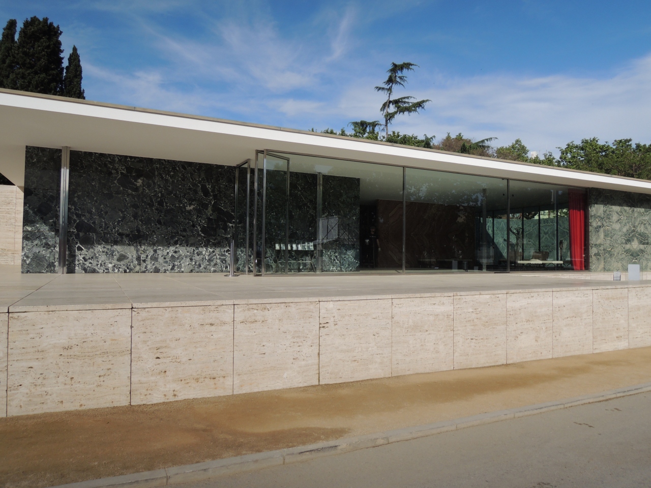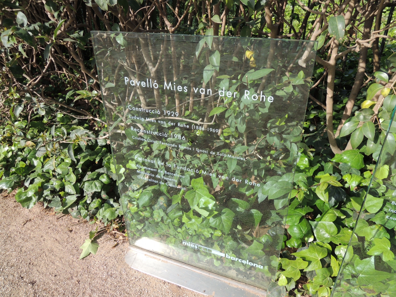 プッチ・イ・カダファルクと磯崎新によるカイシャフォルムを見た後、このミース・ファン・デル・ローエ記念館を見に行きました。この建物はミース・ファン・デル・ローエが1929年バルセロナ万国博覧会で建築したバルセロナ・パヴィリオンを復元したもので、ミース・ファン・デル・ローエの作品は、大きなオフィスビルのロビーによく使われているバルセロナチェアのレプリカに馴染みがありましたが、実際の建築物を見るのはこれが初めてでした。実際に見てみると、バルセロナで良く見た曲線的なガウディの作品群とは対照的に、鉄・ガラス・大理石の直線で構成される建築物は、シンプルな美しさがあり、浅く水が張られたプールと中庭の彫刻が印象的でした。開館時間前で建築物を見に行っただけで、入館はしませんでしたが、外からガラス越しに見るロビーにはやはりバルセロナ・チェアが置いてありました。