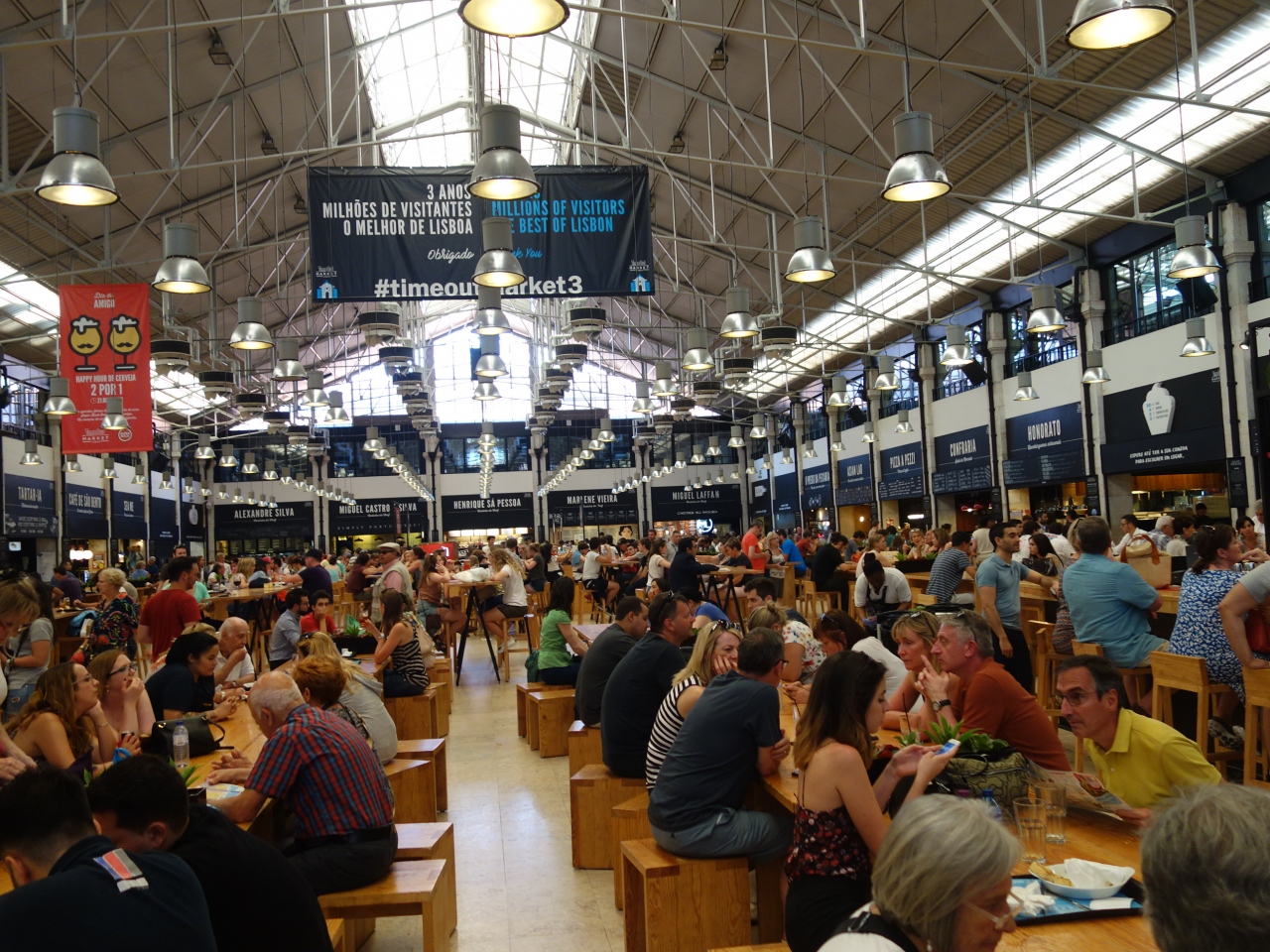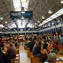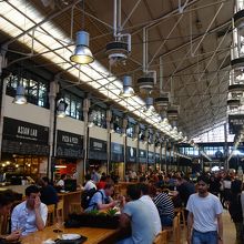 ケーブルカーをおりて歩いていたらショッピングモールみたいなところがありました。入ってみたら市場でした。午後で,市場は閉じていたのですが,奥へ行くと,高い天井の下に広いフードコートがありました。スツールタイプの高い椅子とおおきなテーブル。壁際のいろいろなお店で買ったものをこのテーブルでいただきます。お店はたくさんありますので楽しめます。明るくていいところです。