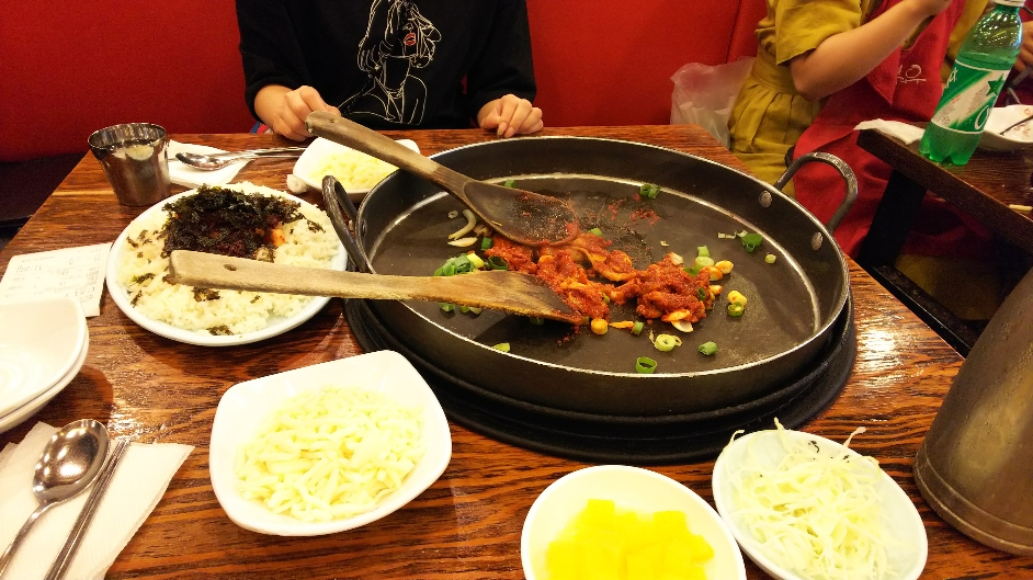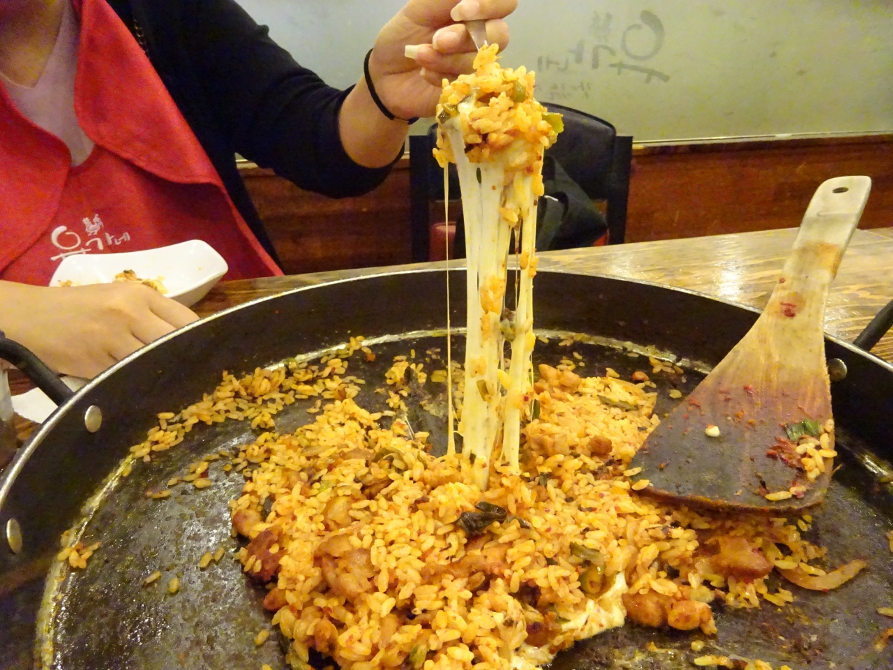 まずタッカルビを注文し、それからご飯を足す食べ方も美味しいですが、私はいつも最初からタッカルビチャーハンをオーダーします。チーズのトッピングも欠かせない!以前はチャーハン2人前に対しチーズを1人前でしたが、ある日、チーズも2人前にしてみたところ辛さが和らぎマイルドになって美味しかったので、以来ずっと2人前をトッピングしています。