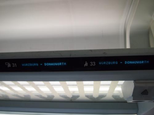 平日の混雑の様子が予想付かなかったので、"ヴュルツブルク--ドナウヴェルト"の座席指定をしました(数ユーロの追加料金がかかります)。 日本の新幹線のように自由席車両・指定席車両が分かれているわけではなく、切符を買ったときに座席を指定すると、座席の上部分に表示がされます。 表示がなかったり、区間外なら空いているので座ってもOKという事です。