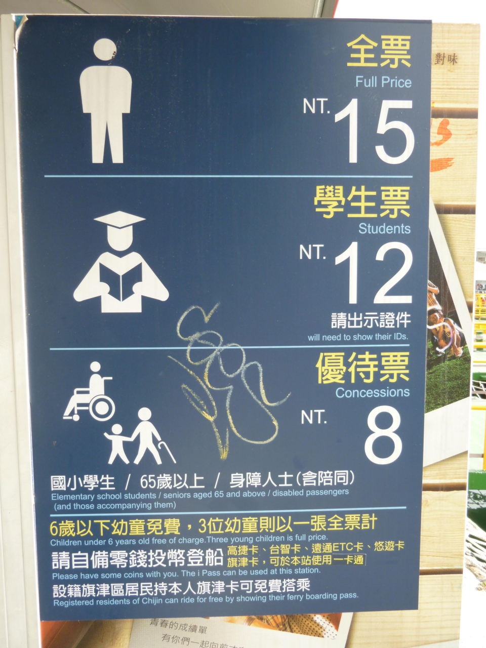 フェリーは頻繁に運行していて大人片道15元、約10分の船旅を楽しめます。