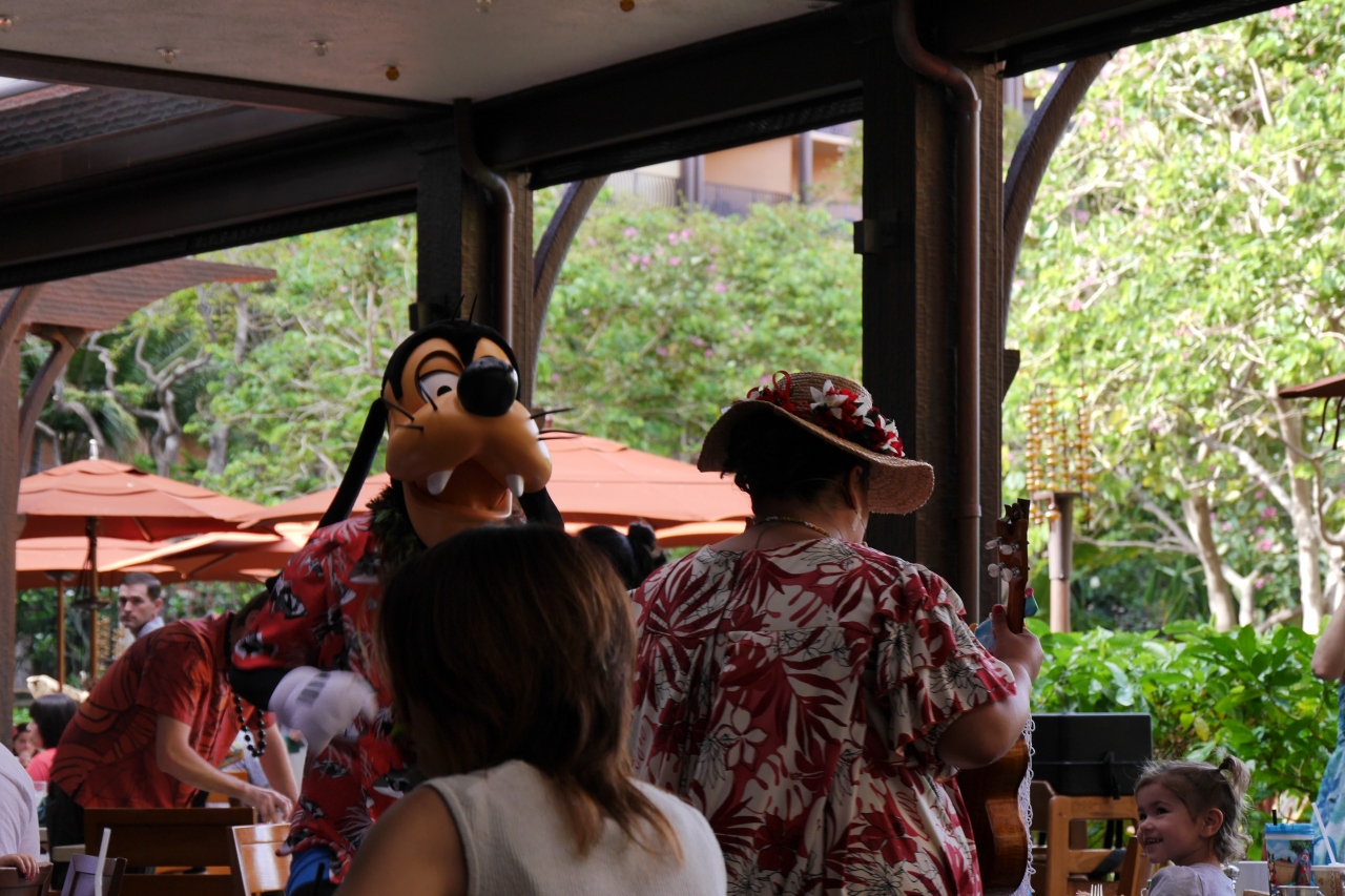 食べているとミニーちゃんとグーフィーがテーブルをまわって来てくれます。