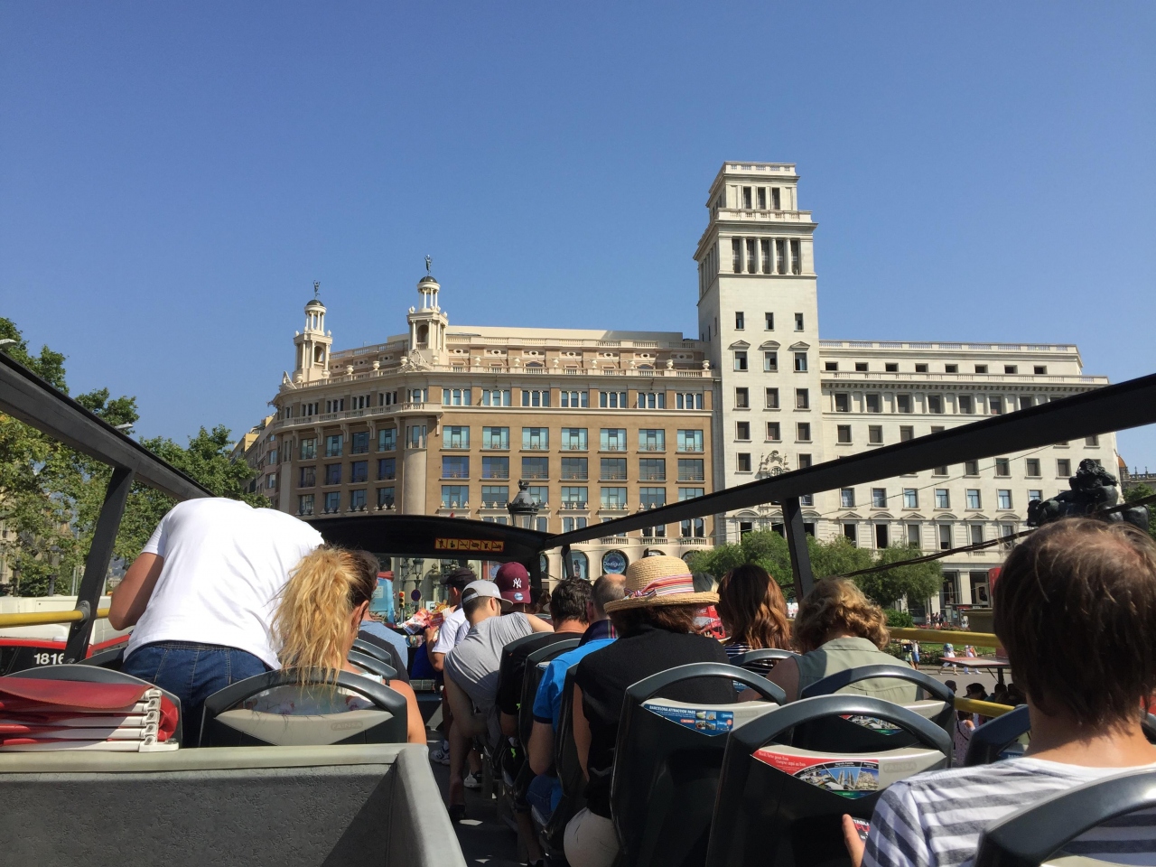 滞在中、バルセロナシティバスに乗車しました。観光地でよく目にするオープントップバスです。起終点はカタルーニャ広場。その広場には数台のバスが停まっていて、チケット売り場も備わってます。バス付近には数人のスタッフもいるので、英語ではありますが、不明な点を聞くことも出来るし、親切です。ルートは2路線ありましたが、いろいろと観光スポットを回っていたので、1路線しか乗れませんでした。それでも、バルセロナの街並みをオープントップの2階席から眺められたということを考えれば、乗って良かったです。