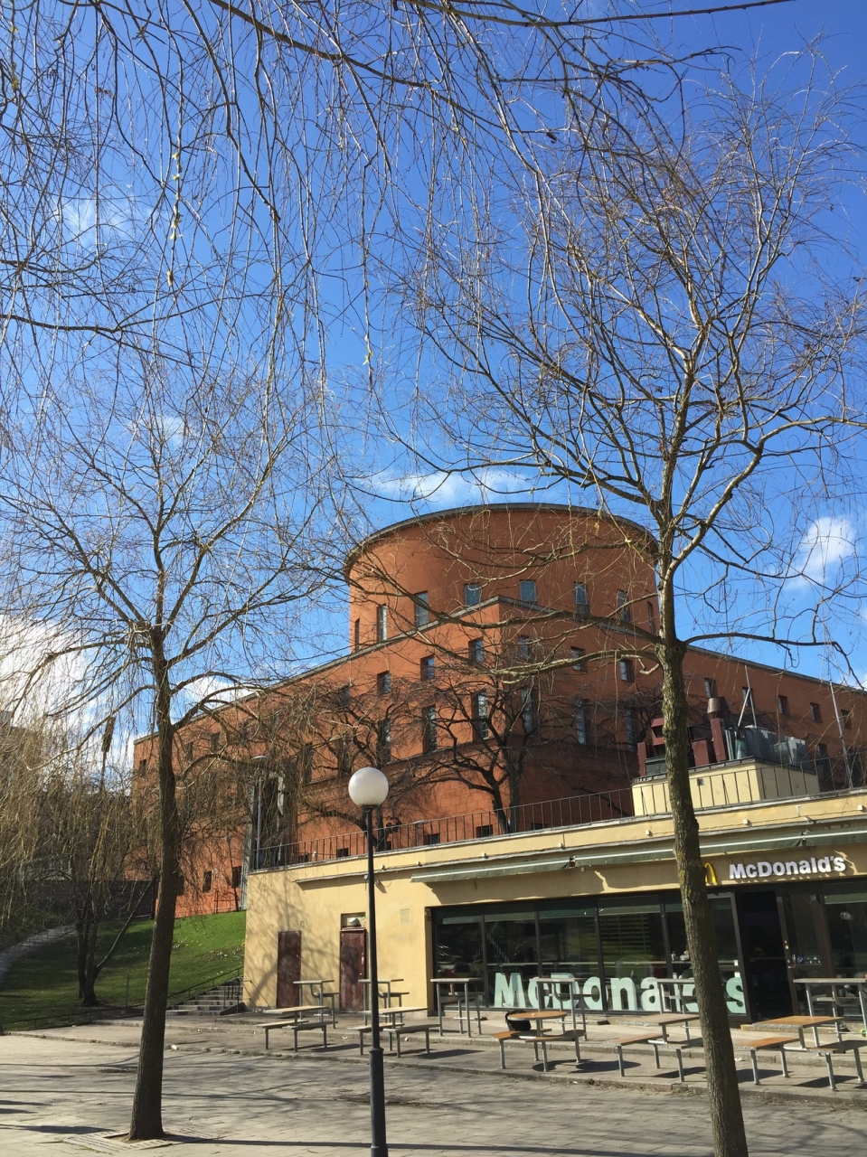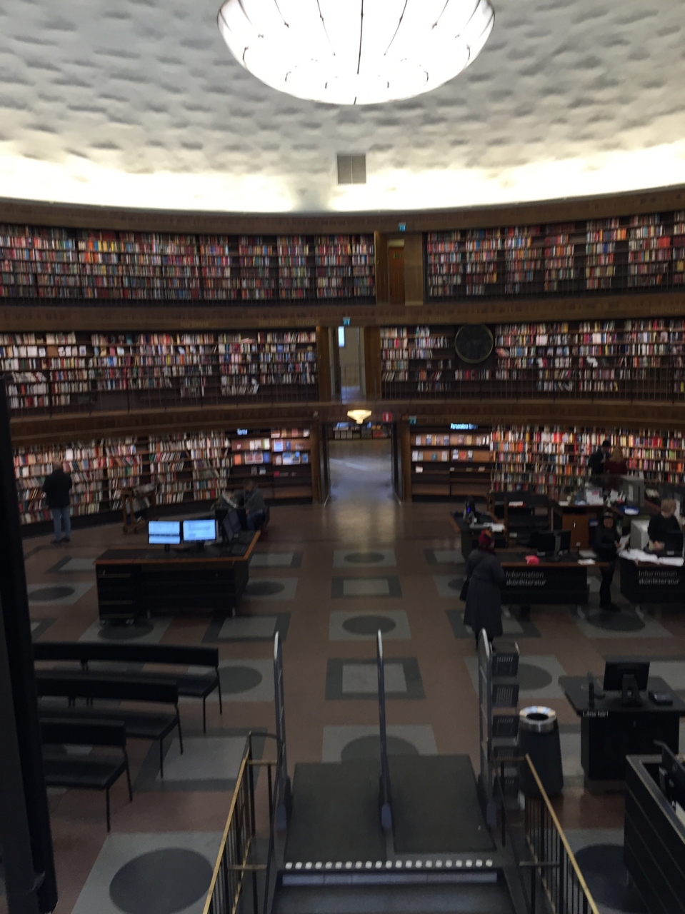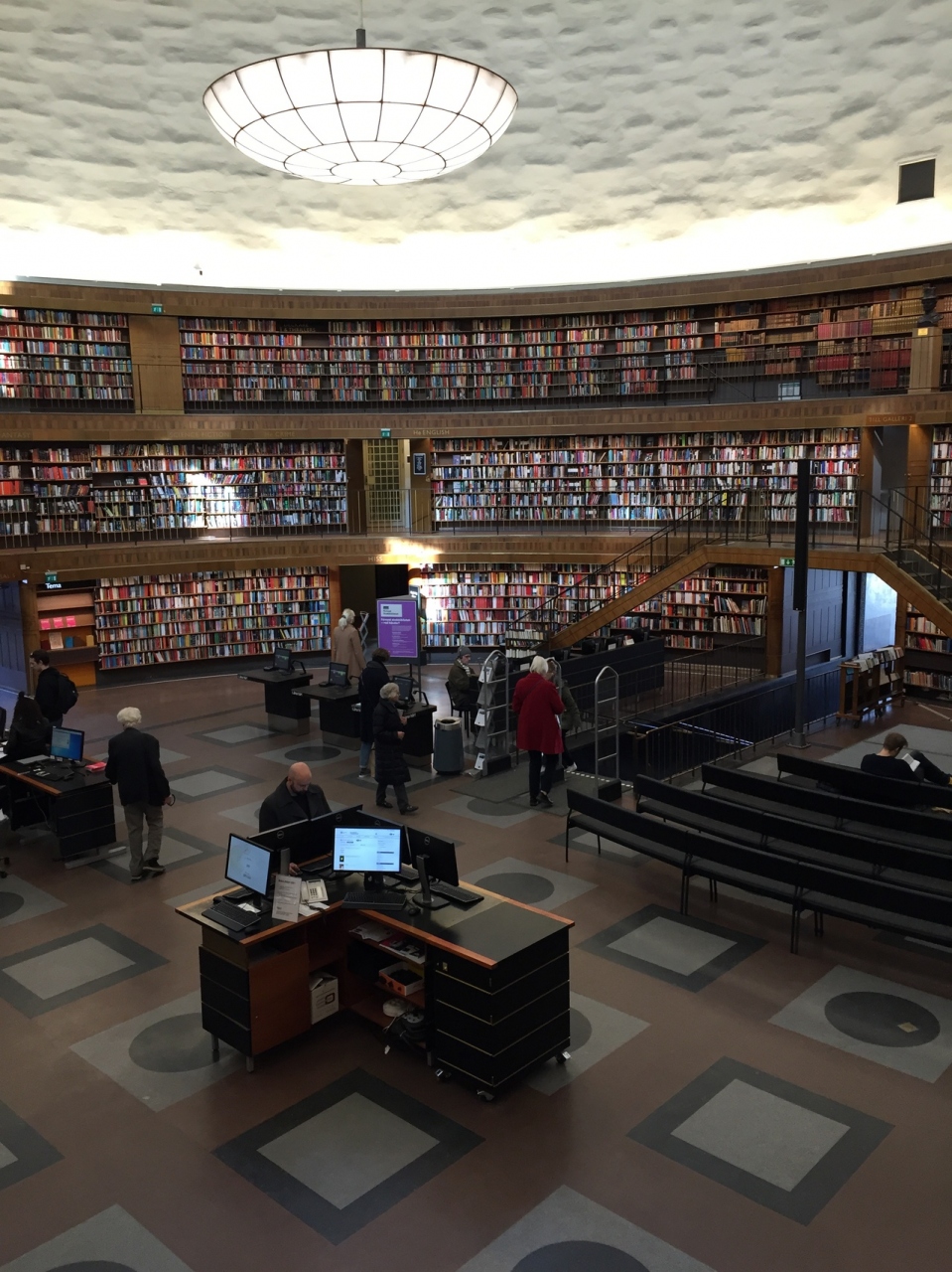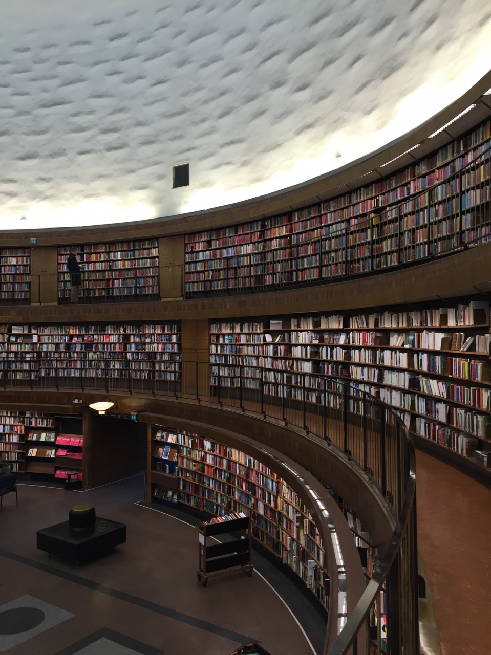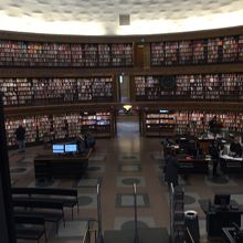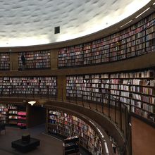 正面階段を上がっていくと、メインの円形の閲覧室に着きます。三層の書架が円状なっている光景はシンプルさと機能性を感じます。デザインは北欧モダニストの巨匠アスプルンドです。