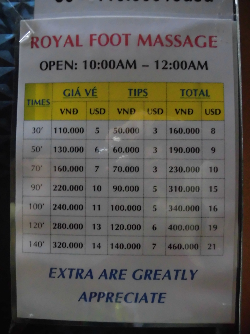 料金体系が変わりました。チップ込みで30分16万ドン(約800円)、50分19万ドン(約950円)、70分23万ドン(約1150円)、90分31万ドン(約1550円)、100分34万ドン(約1700円)、120分40万ドン(約2000円)、140分46万ドン(約2300円)から選べます。ただ90分からは割高になっていますので、従来通り50分か70分をお勧めします。また、以前は短パンにトイレで着替えていましたが、今は1階にも2階にも更衣室ができましたのでよかったです。
