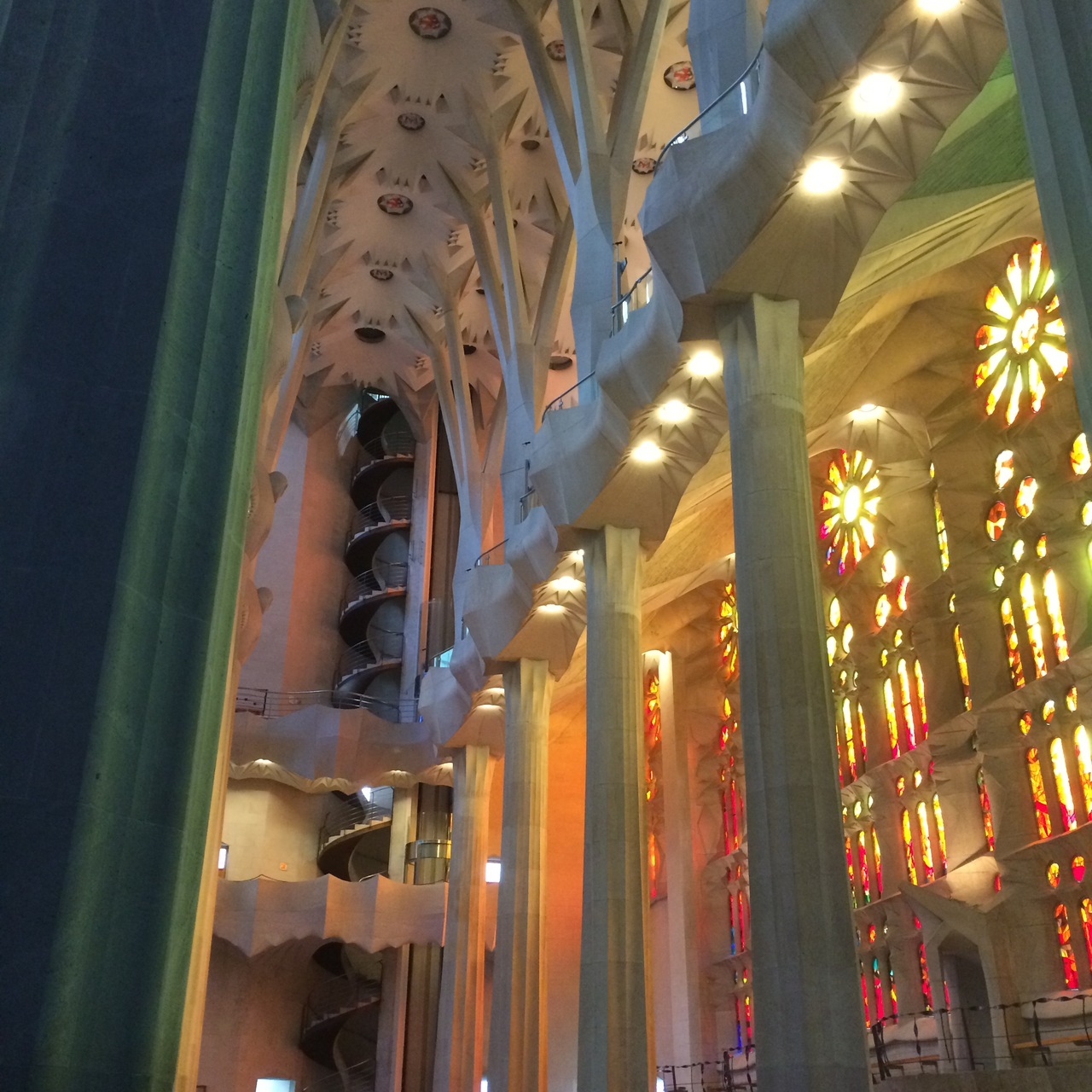 内観は、ステンドグラスの色合い、祭壇、支柱など、今まで見たどの教会とも異なる斬新なものでした。