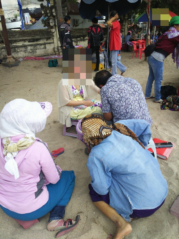 若い頃にクタビーチで三つ編みをやったことを思い出し、娘に勧めたところ頑なに拒否されました(笑)。「数本だけでいいから」「お母さんがお金を出すから」と言ってしぶしぶ納得。ビーチに着くとあっという間におば様たちに囲まれる娘。「3本だけ」と三つ編みに挑戦(そのうちにおじ様も登場し「ヘナタトゥーをやらないか?」と誘われ、手の甲にだけデザインを施してもらう。これは気に入った様子)。全部で20万ルピアでした。