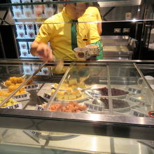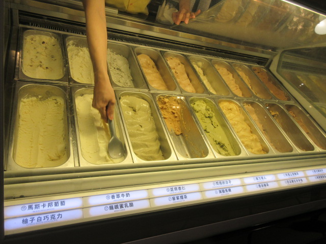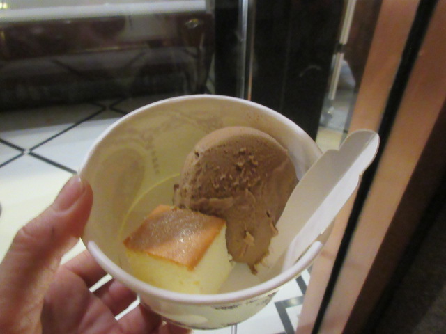 大人気の宮原眼科、ショップと併設のアイスクリーム店が客が多いです。昼間は並んでいるので、夜に。日本人客が多いので、スタッフが対応になれています。アイスクリームのトッピングの種類がいろいろあり、小さなケーキをトッピングしてもらいました。トッピングやアイスの種類選びに迷ったら、日本語メニューの紙をもらいましょう。アイスクリームはシングル1個が90元でトッピング一個無料です。紙カップでなく、ワッフルボールに入れてもらうと+20元です。
