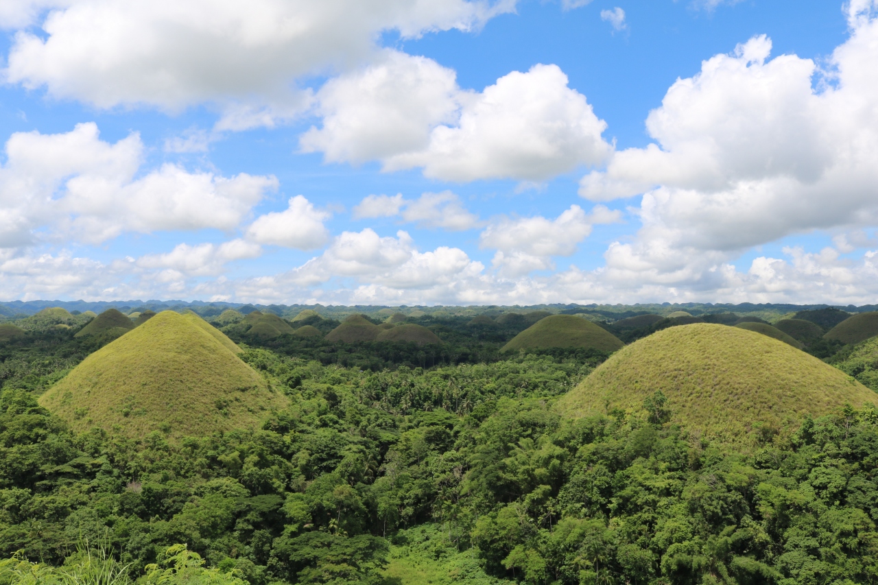 高さ30mほどの円錐形の丘が1000個以上も連なる不思議な光景を見ることができました。乾季の時期は植物が枯れて茶色の丘になるそうだけど、5月下旬でも緑のまま。乾季の終わりでこれじゃぁチョコレート色になる日なんかあるのかな。