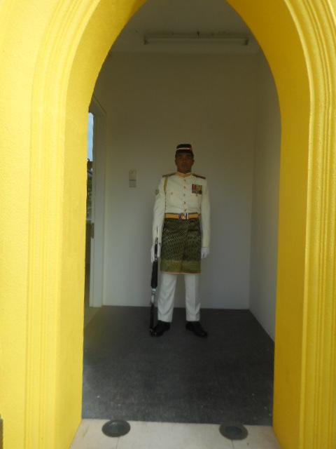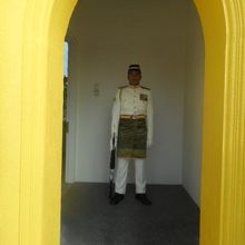 流石、王宮と思う広い敷地の中に、遠く王宮がありました。門外からしか望めませんが、明るい太陽の下に黄色の屋根が生えて、整備された庭とマッチしていました。門前の両脇に、各、各、歩兵と馬に乗った警備兵とが居て、観光客の写真撮影スポットになっていました。