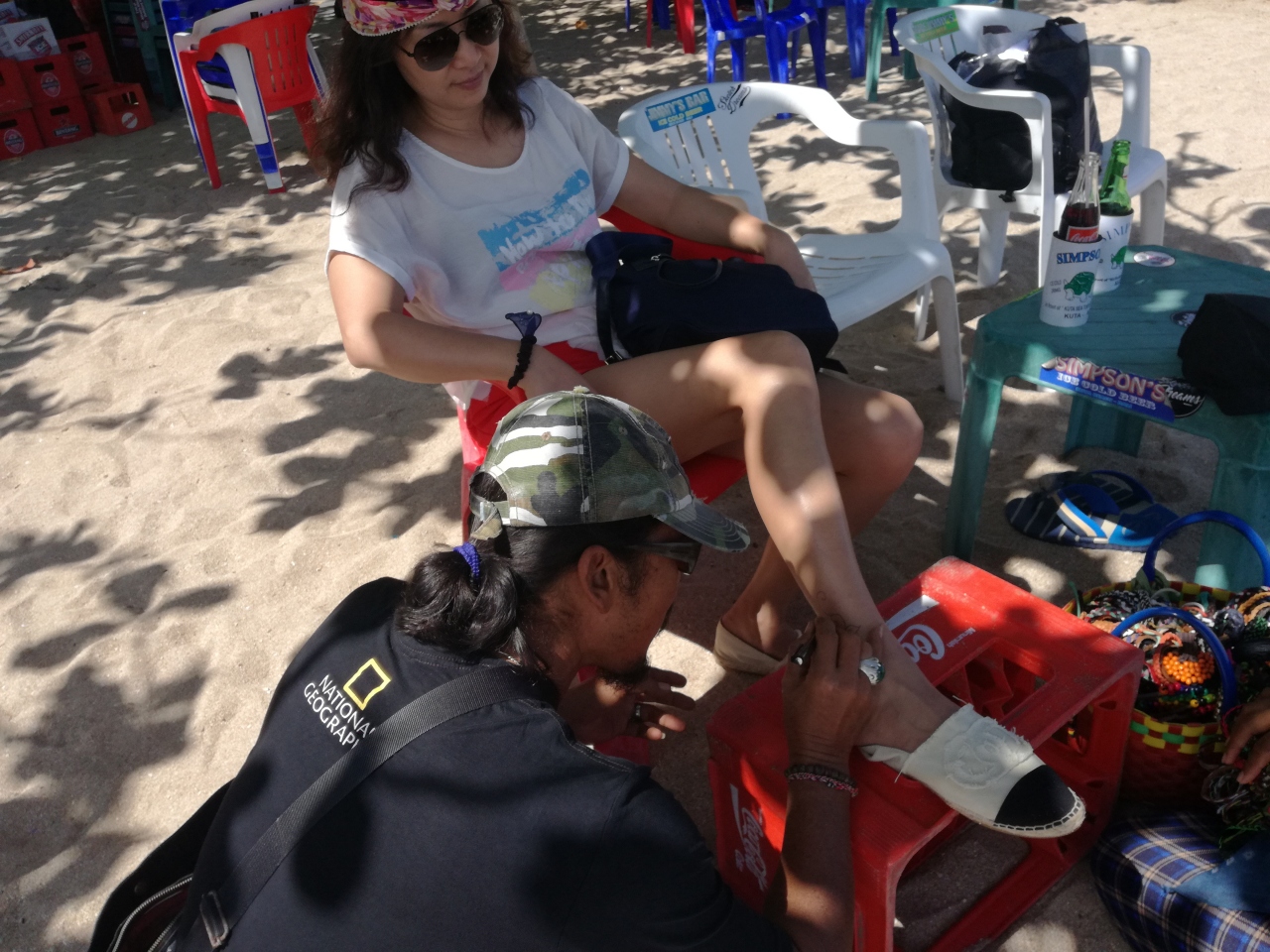 ビーチには木陰にシートを置いただけの店?がたくさんあり、コーラやビール等飲み物を頼めばフリータイムでシートを利用出来ます。私達が行った時にはビーチも混んでおらず、シート1日独り占めも全く嫌がられませんでした(ビール4本、コーラ4本飲んだ日もあったけど、1本でも全く嫌がられません)。テイクアウトしたものを食べるのもOKです。ビーチ内にはレストランは無いのですが、ビーチから見えるすぐ近くにオープンシートの安レストランが数店あり、配達もしてくれますが、シートの位置を説明するのが大変なのでテイクアウトが無難です。