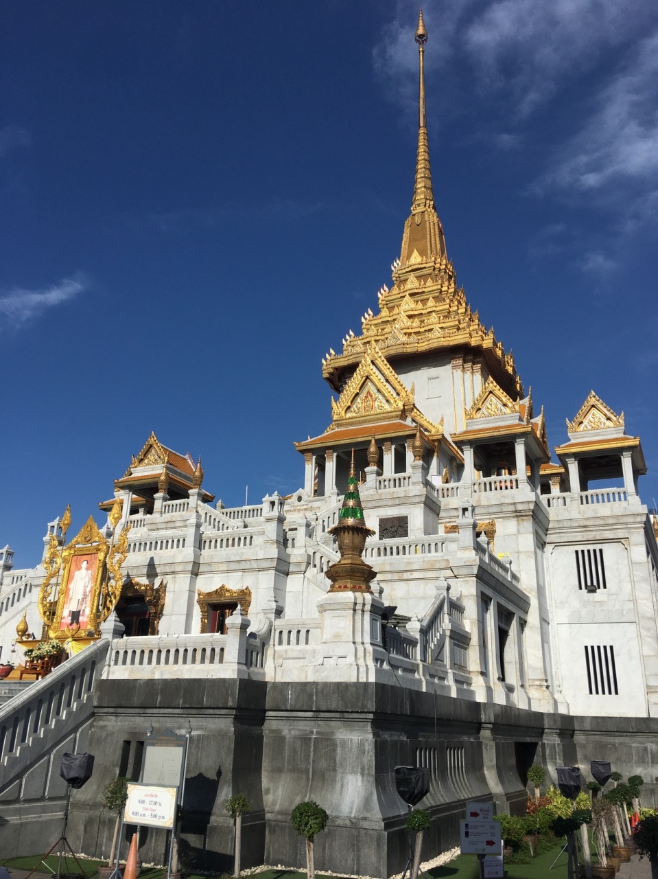 仏教寺院と言うよりもどちらかと言うとお城のような外観の印象を受けました。白色の壁や黄金色の装飾の屋根等非常に美しかったです。寺院には近代的な建築物でした。太陽がどこにあるかにもよりますが、人の正面からもしくは少し角度をつけて写真を撮るのが画になると思いました。