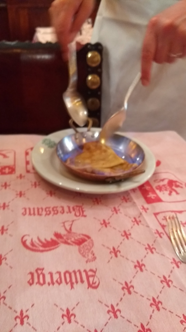 デザートはこれまた定番っぽい、クレープをカルヴァドスでフランベした奴。目の前でカルヴァドスをかけてライターで火を付け、フランベしてくれた。