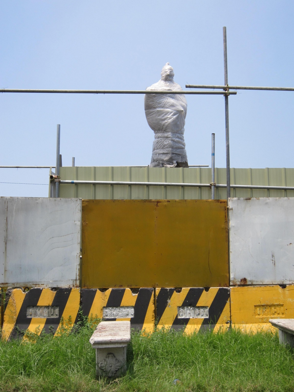 近隣の工事のあおりで像自体がラッピングされてまるでミイラ