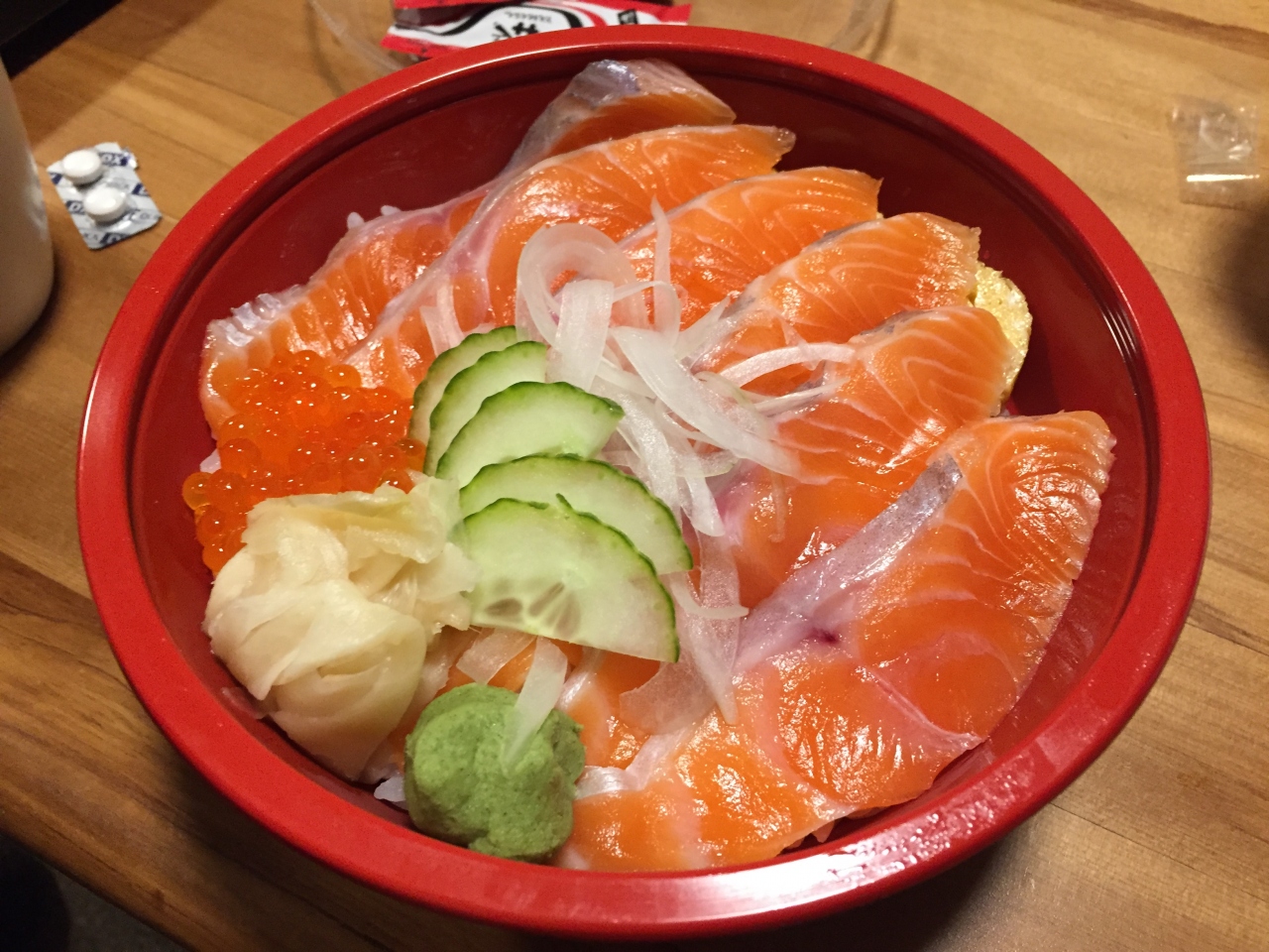 私たちは座れなかったので、サーモン丼をテイクアウェイ(持ち帰り)にしてもらいました。