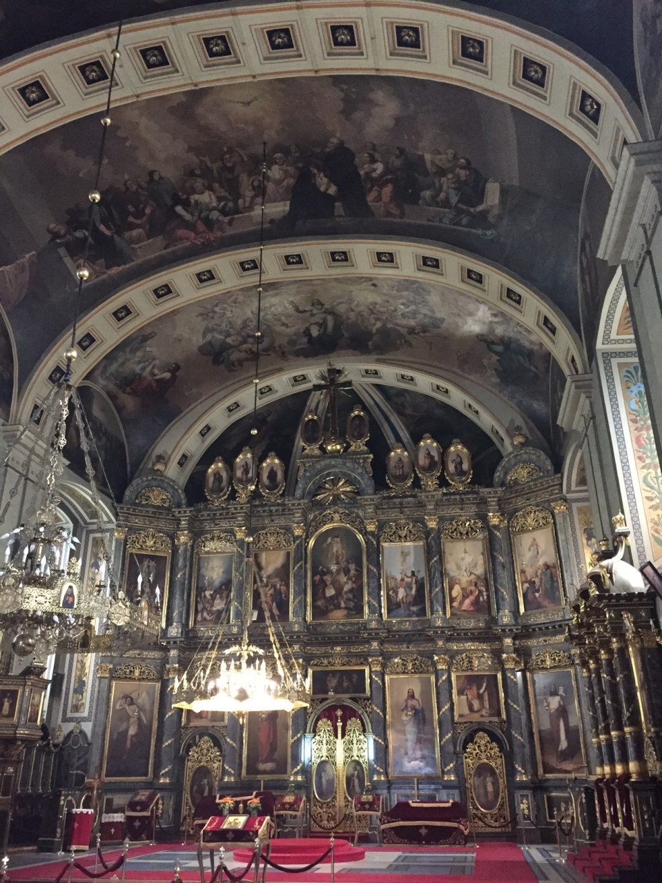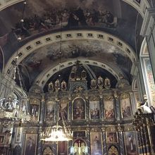 黄金とエメラルドグリーンを基調とした祭壇は二段構成で天井まで届く高さです。