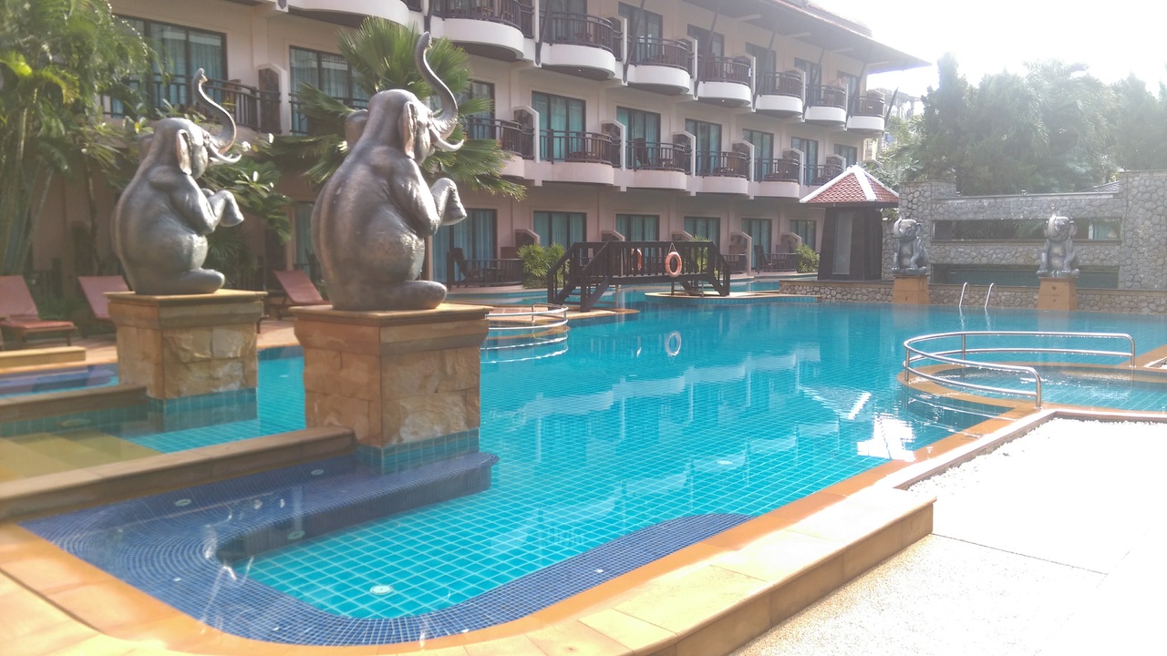 バルコニーで喫煙可能で、夜にライトアップされたタイらしいプールを眺めながら飲むビールは最高。