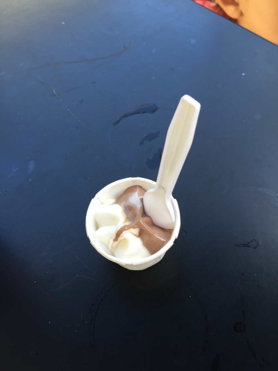 ワイケレのGODIVAに売っている、イチゴとバナナにたっぷりチョコレートがかかったのを、初めて食べてみました。おっきいイチゴと厚切りバナナで食べ応えがあり3人で食べて丁度いい大きさでした。暑い日だったので、たべているうちにチョコが溶け始めていました。小さな器に入ったGODIVAアイスを3人分サービスでくださり、冷んやりと冷えて美味しかったです。