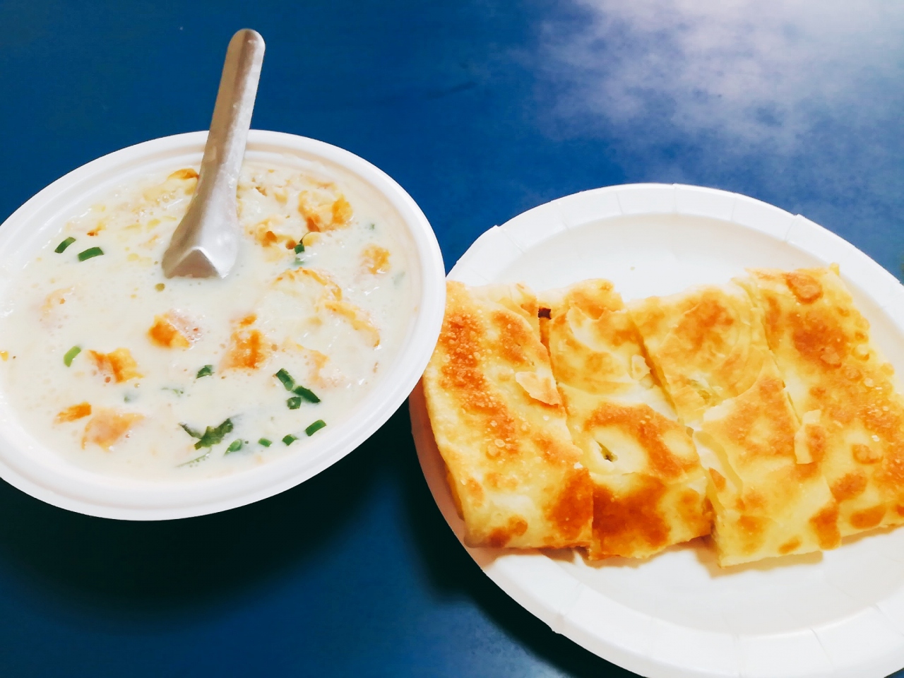 程良い塩加減とおぼろ豆腐のような優しい食感が朝ごはんにピッタリの「鹹豆漿」と、うす焼き卵をパイ生地で包んだ「蛋餅」をオーダー。