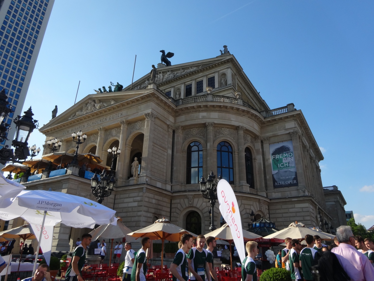毎年6月中旬に、JP Morganという、5.6㎞のマラソン大会がフランクフルトで開かれます。色々な企業や、施設がそれぞれお揃いのTシャツを作って多数参加しているので、6万人以上が参加しますが、そのスタート地点が、アルテオペア付近になります。