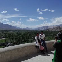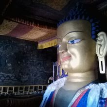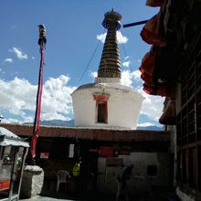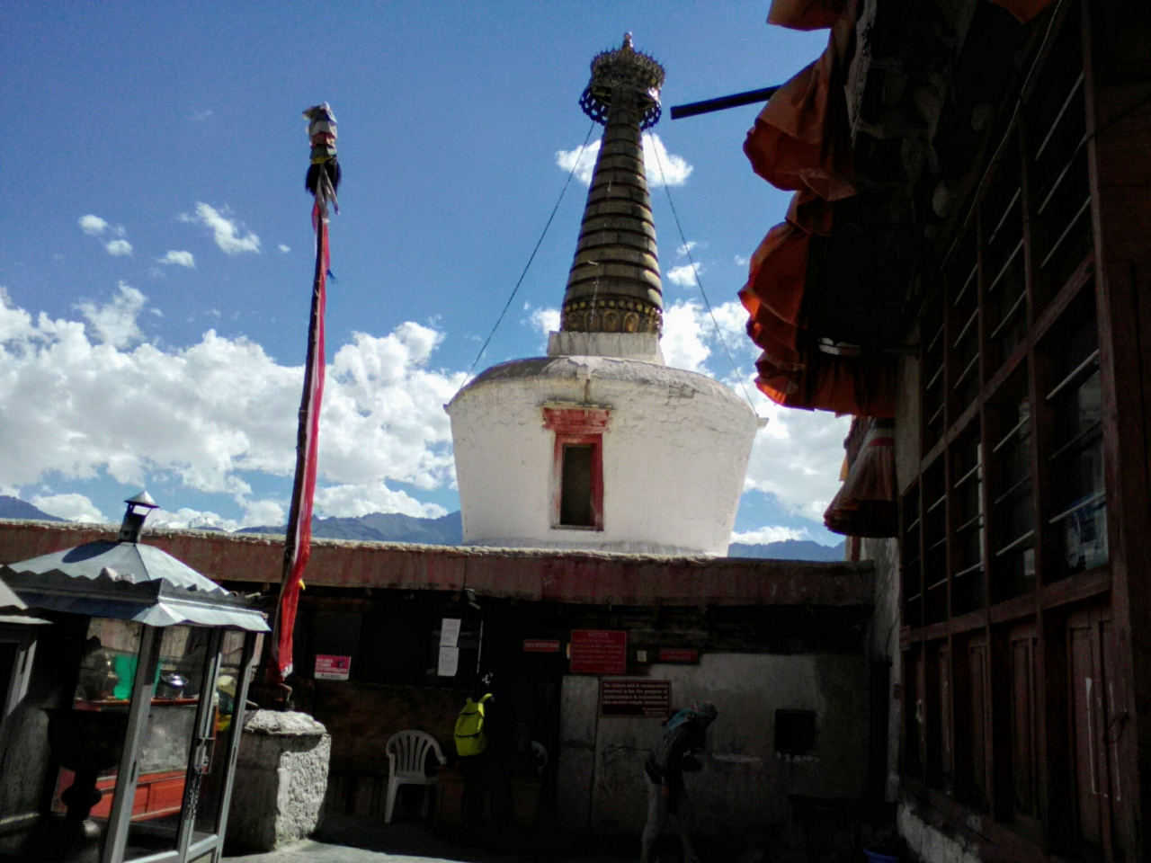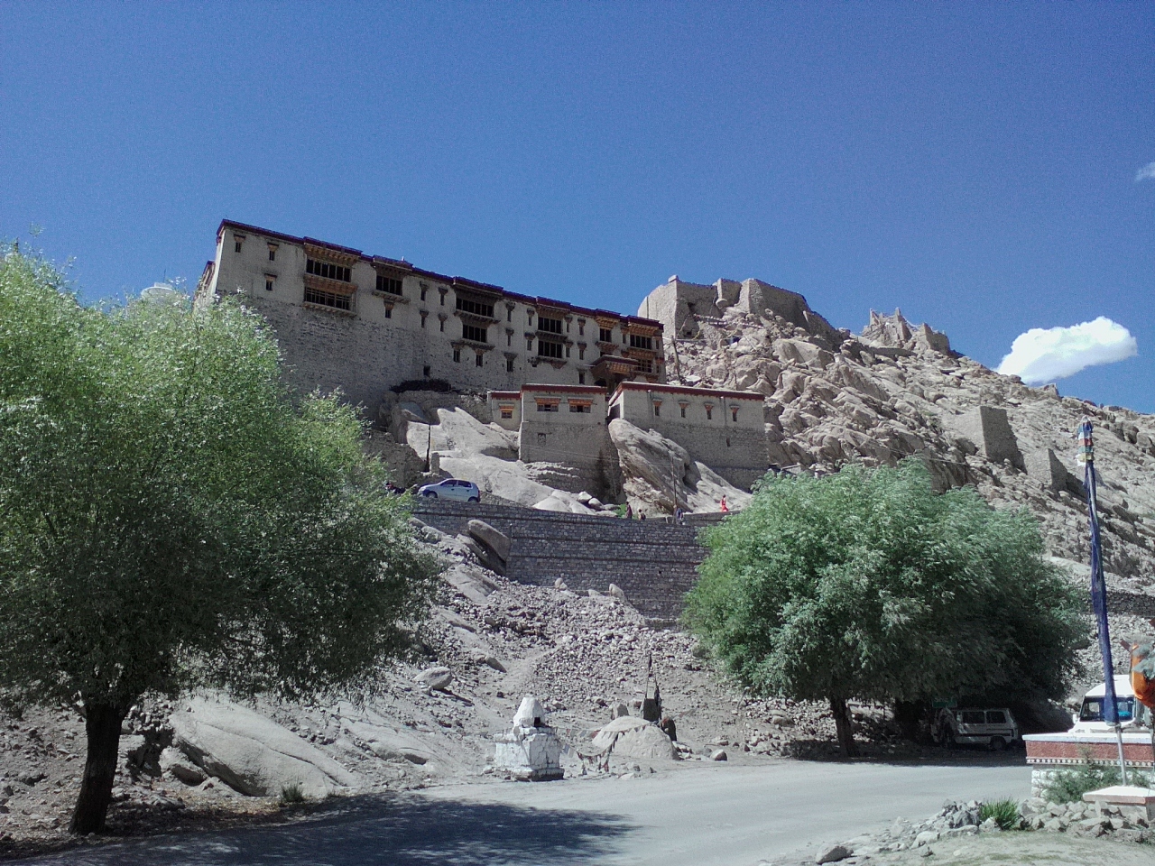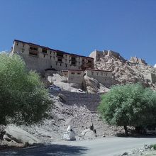 幹線道路のすぐ脇の岩山の上にゴンパと王宮が建っています。斜面を登り「←Temple」の案内表示に従って進むと本堂にたどり着きます。入場料は30Rs。中に入ると大仏の上半身が見えますが下を覗き込むと全身が見え(かなり薄暗いですが)、今いるのが本堂の2階だということがわかります。壁一周には壁画が描かれていますがかなり劣化がすすんでいます。ゴンパからの眺めもすばらしいです。また、入口からレー方面に200mほど戻った曲がり角にある岩肌にはギャワ リンガという五体の如来像が彫られた線刻画があります。かなり地味なスポットですが時間のある方はどうぞ。