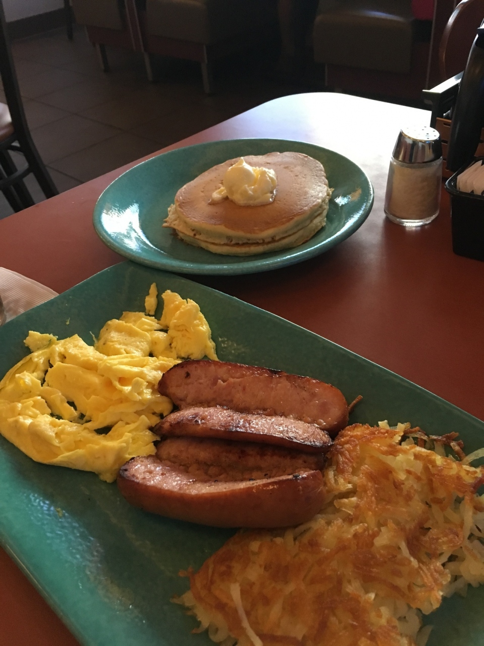 グアムプレミアムアウトレットの敷地内にありシルバーの倉庫のような建物ですが、店内はファミリーレストランと言った感じで明るく綺麗です。パンケーキのセットメニューからスモークソーセージとハッシュドポテト、スクランブルエッグを注文。パンケーキは2枚でお願いしました。コーヒーはポットが置いてあり好きなだけ飲めました。パンケーキはパリッと焼いてありましたが中はふわふわで美味しかったですが、他のセットメニューは正直美味しく感じませんでした。コーラと合わせて20数ドルと朝食にしては高く感じました。