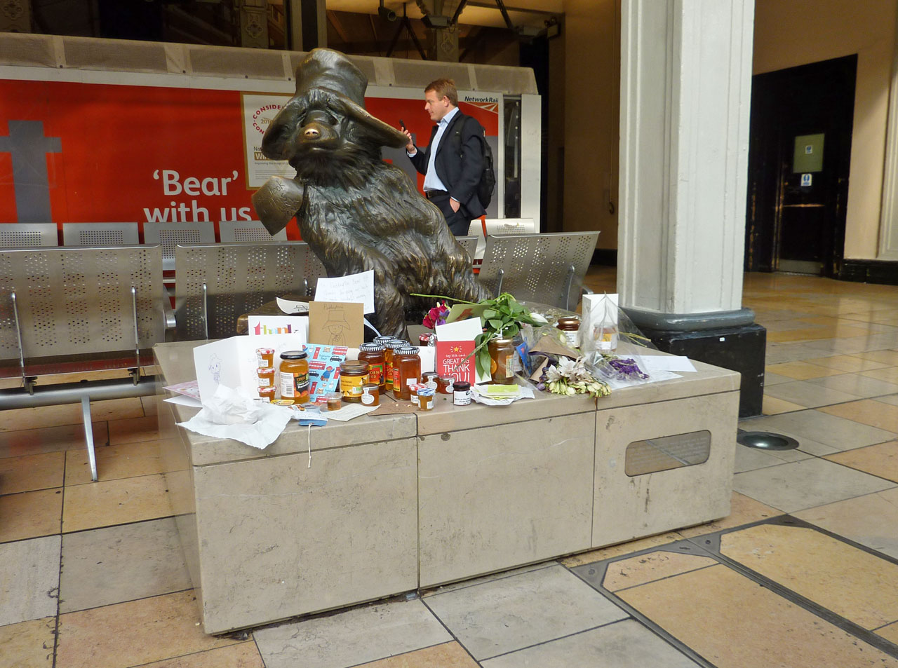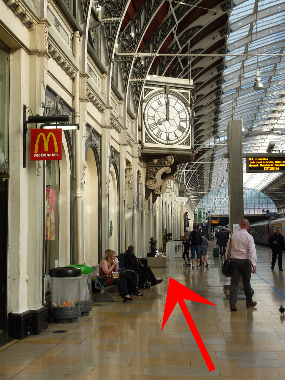 知られた「くまのパディントン」の像は構内、マクドナルドの先にありました(写真の矢印)。