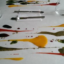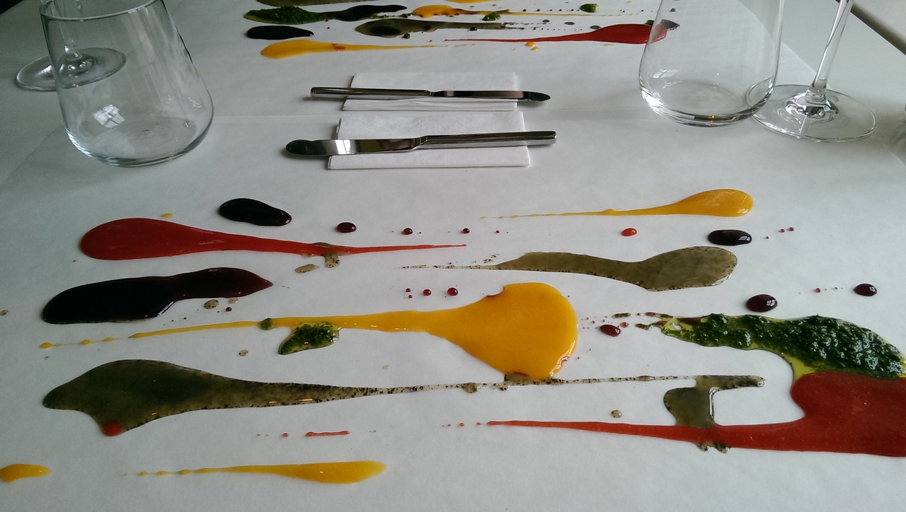 アラカルトで注文しましたが、オーダーしたお料理の前に、パンを楽しむための色とりどり鮮やかな発色のソースで、テーブルの透明のフィルターを現代アートしてくれます。フルーツやバジルのソースとひまわり種などをパンに付けてお料理を待ちます。