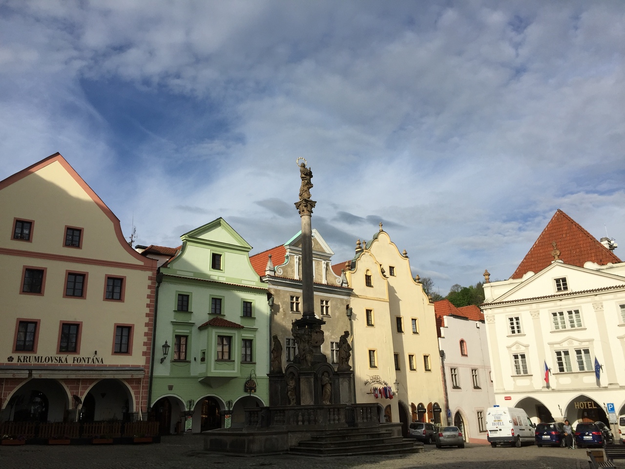 チェスキークルムロフの街の中心地にある小さな広場です。お役所やカフェ、ピザ屋さんなどがぐるりと囲っています。