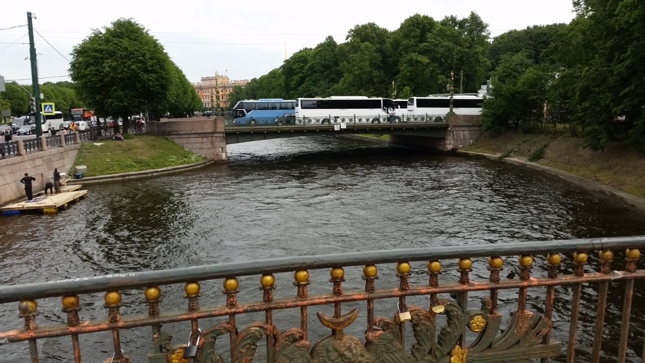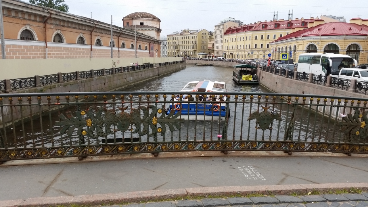 ツアーでそばを通りました。運河という名前ですが、大きな河と言った方が良いほどで、観光船が行き交う大きな運河です。このそばでバスを降り、血の上の教会の遠景写真を撮りに行きました。橋が架かり欄干の模様が素敵でした。