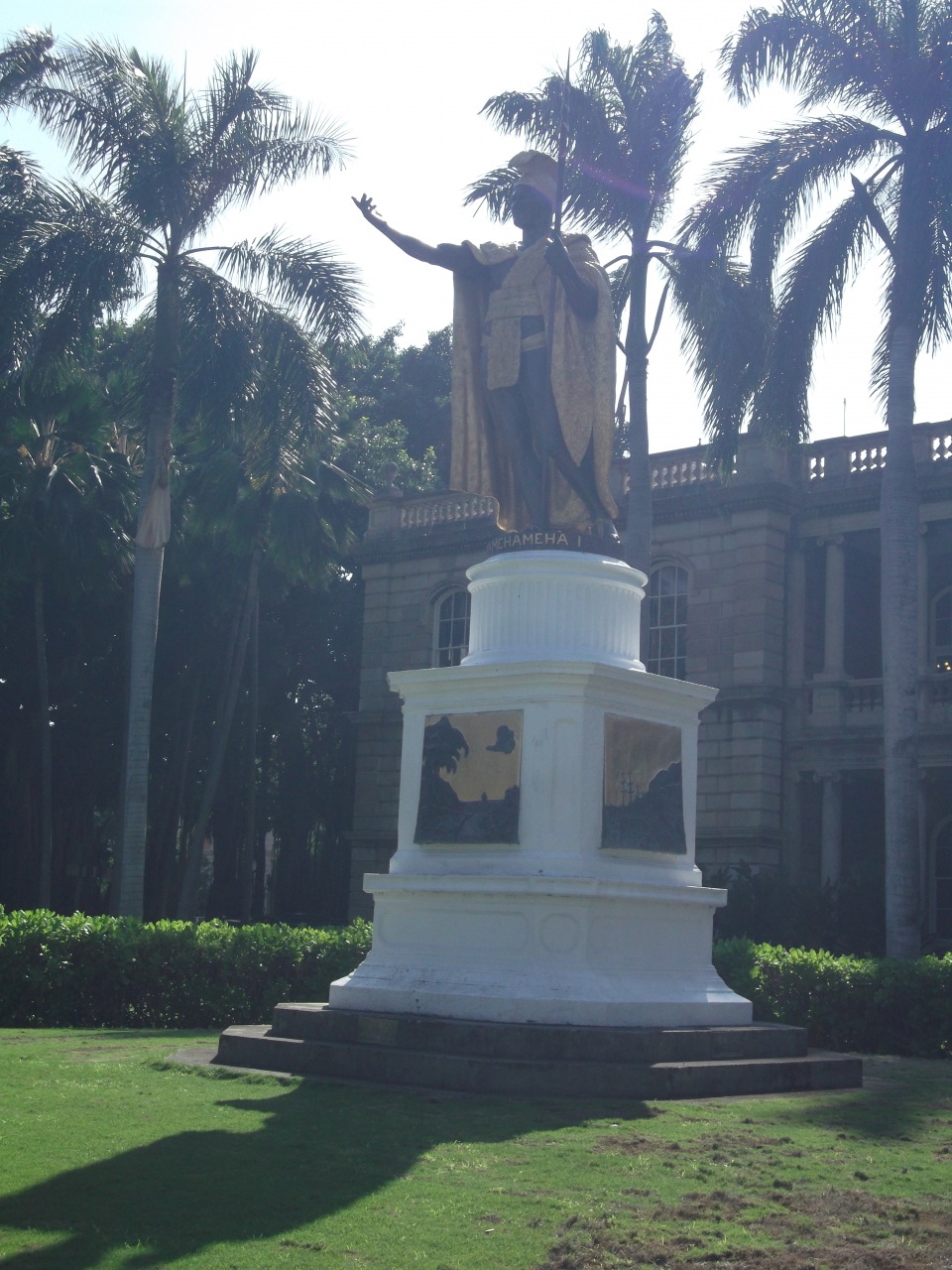 イオラニ宮殿のすぐ近く、裁判所の前に堂々と立つカメハメハ大王。金色の衣装が印象的です。手を広げて立つ姿は、やはり王様の風格がありますね。入れ代わり立ち代わり観光客が来て記念写真を撮っていましたが、ここも日本人が多かったです。