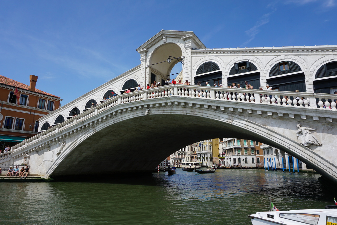 リアルト橋を見ると、ベネチアに来たという実感が湧きます。また、橋の袂にあるドイツ商館の内部がリニューアルされ、2016年、ディー・エフ・エスとしてオープンしていました。16世紀末に石造りの橋に造り変えられたようです。