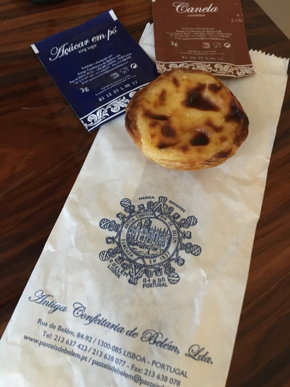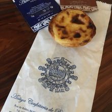 リスボンのいろいろなカフェで食べ比べてみましたが、どこもお店の味オリジナルでいろいろ。ここは柔らかめで、テイクアウトにシナモンと砂糖が別添えで付いてきます。