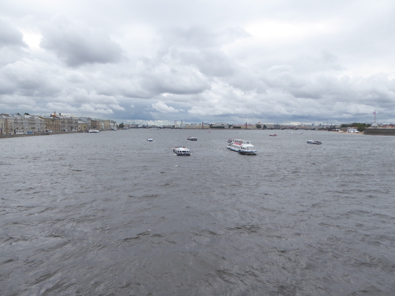 サンクトペテルブルグを観光していると、本流、支流、運河などこの川に関連した風景に遭遇します。ネバ川はサンクトペテルブルグ市内を流れてフィンランド海に注ぐ全長74kmの川で、川沿いにサンクトペテルブルグの街が発展してきています。本流の川幅は平均400mで最も広い場所では1200mもあります。ゆったりと流れる川で、支流や運河も含めて沢山の観光船や観光ボートが運行されています。