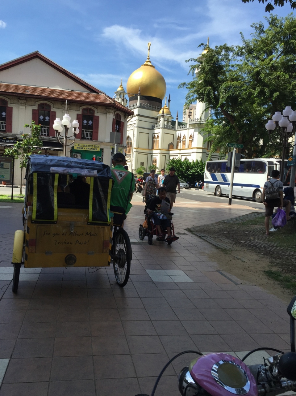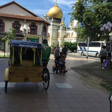 おじちゃんが電動自転車をこいでくれ道の真ん中を走るトライショーに乗り、サルタンモスクをみました。とても迫力がありきれいな建物でした。つぎは、近くまで行って廊下から美しい大ホールを見学してみたいと思いました。