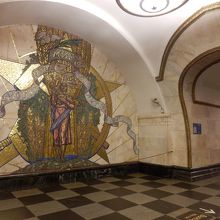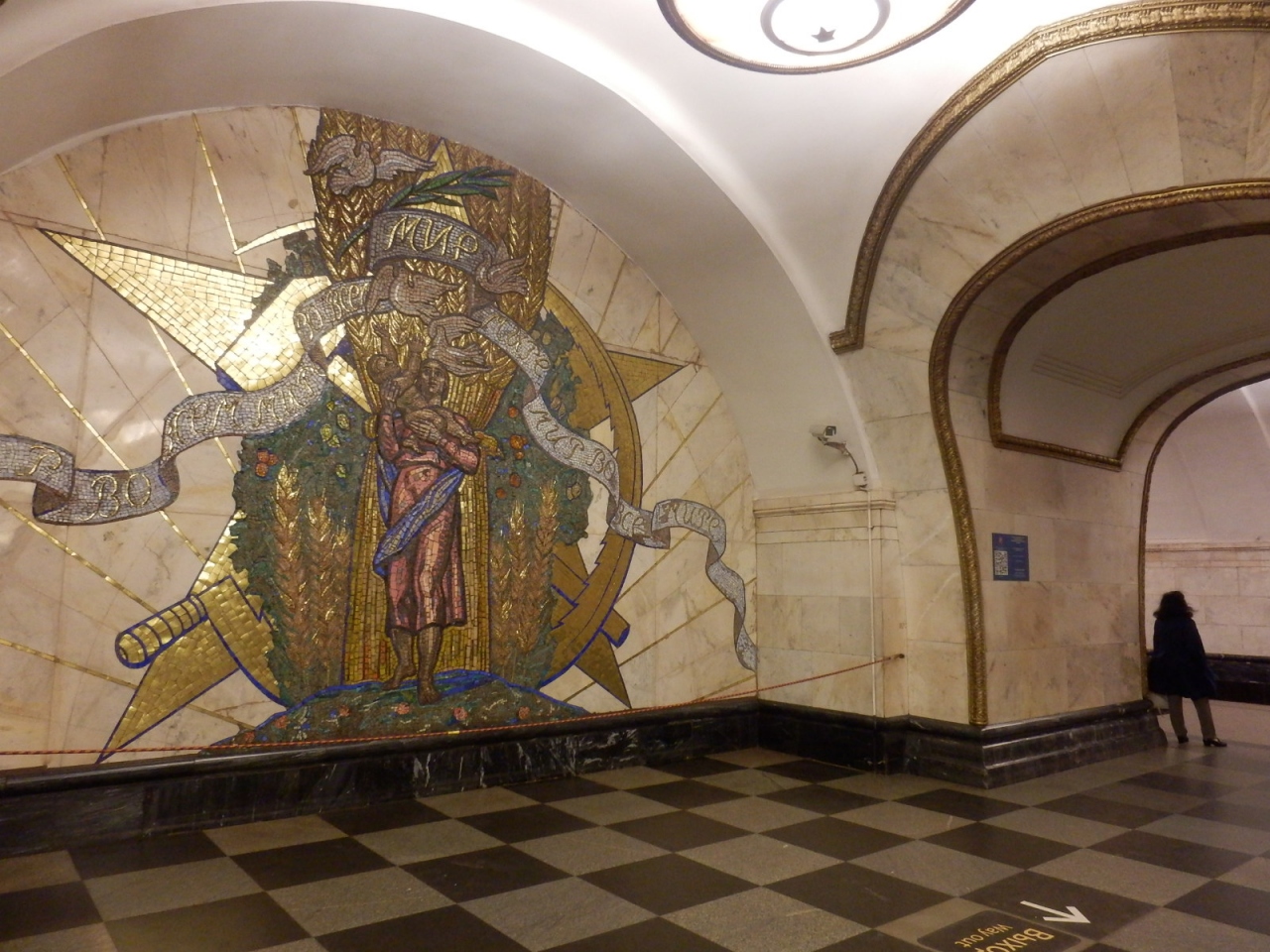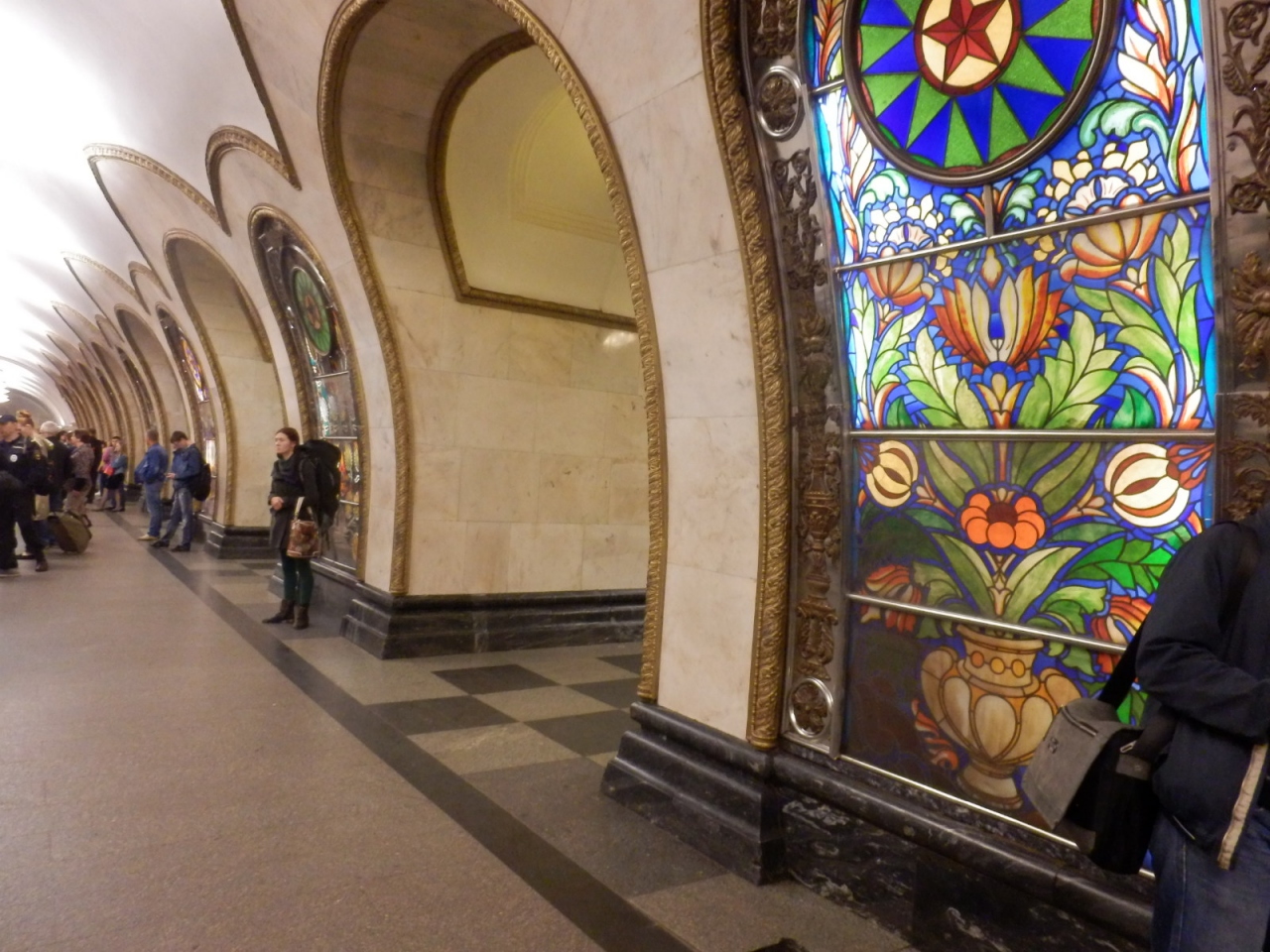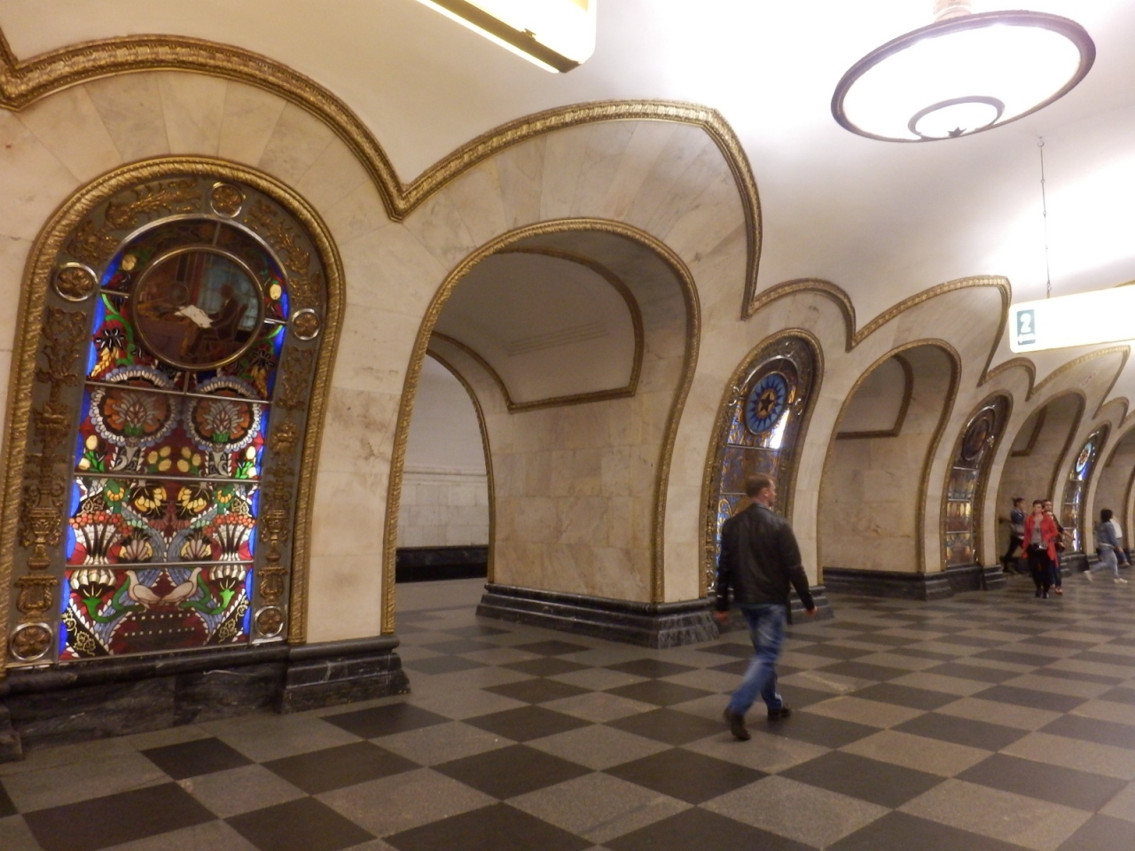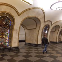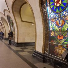 地下鉄5号線のベラールスカヤ駅の隣の駅です。ホームのステンドグラスが素敵だと聞いたので訪れてみたのですが、地下鉄巡りツアーの団体と遭遇しました。博物館等が開かない朝の早い時間帯はこういったツアーが多く開催されているようです。団体ツアー客以外にも写真を撮るだけの観光客も多く見かけました。モスクワの地下鉄はすぐに来るので、時間つぶしがてら訪れるのも良いと思いました。