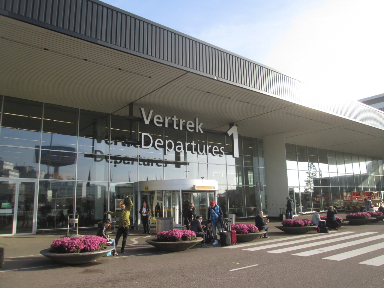 スキポール空港を出発する前に、一度、外に出て見学してみました。入口付近にはきれいな花が咲いている花壇が置かれており、花の周りに座れる休憩用の椅子でもありました。秋の終わる時期でしたが、花の国と言われるオランダならではの光景でした。