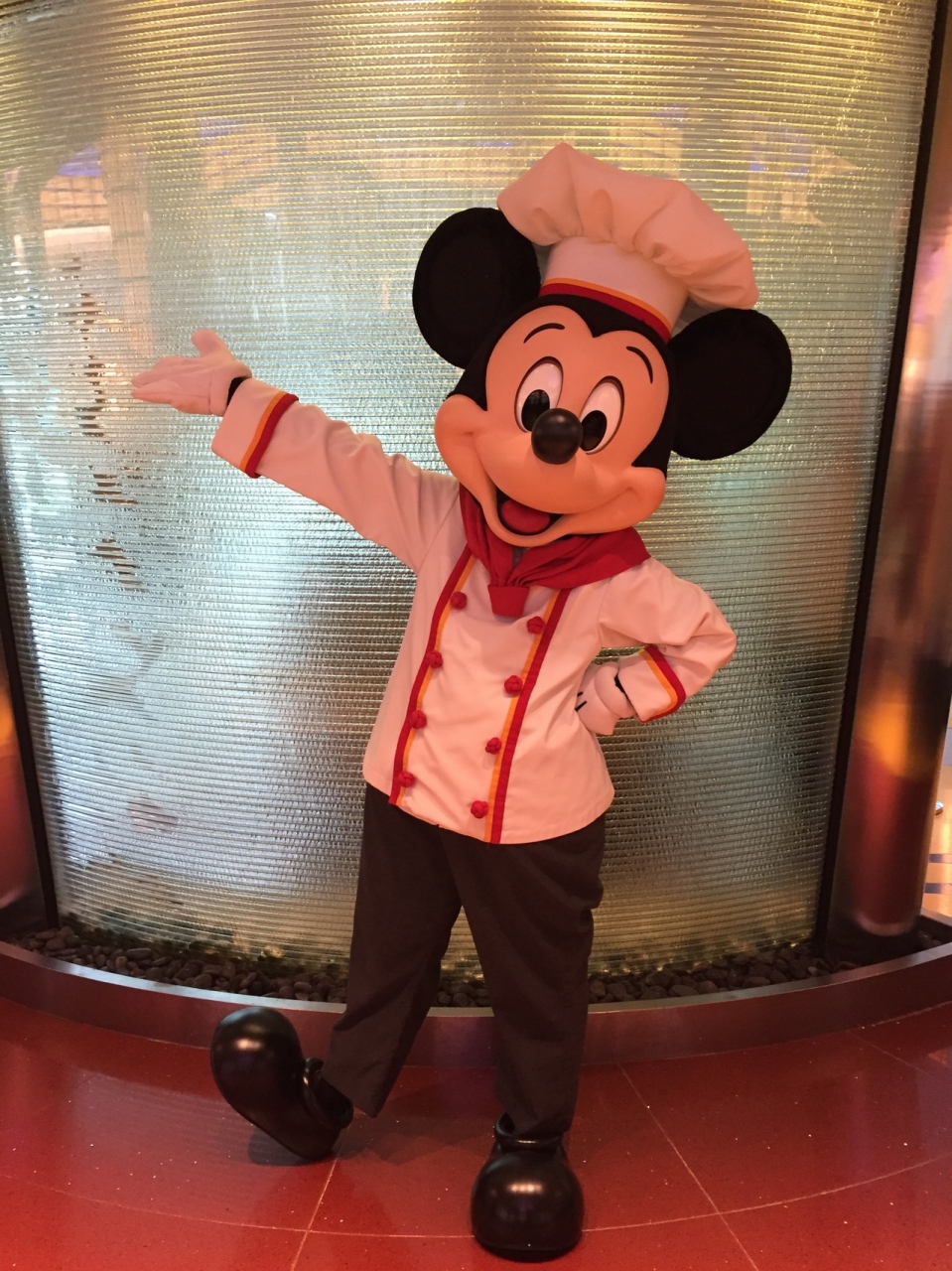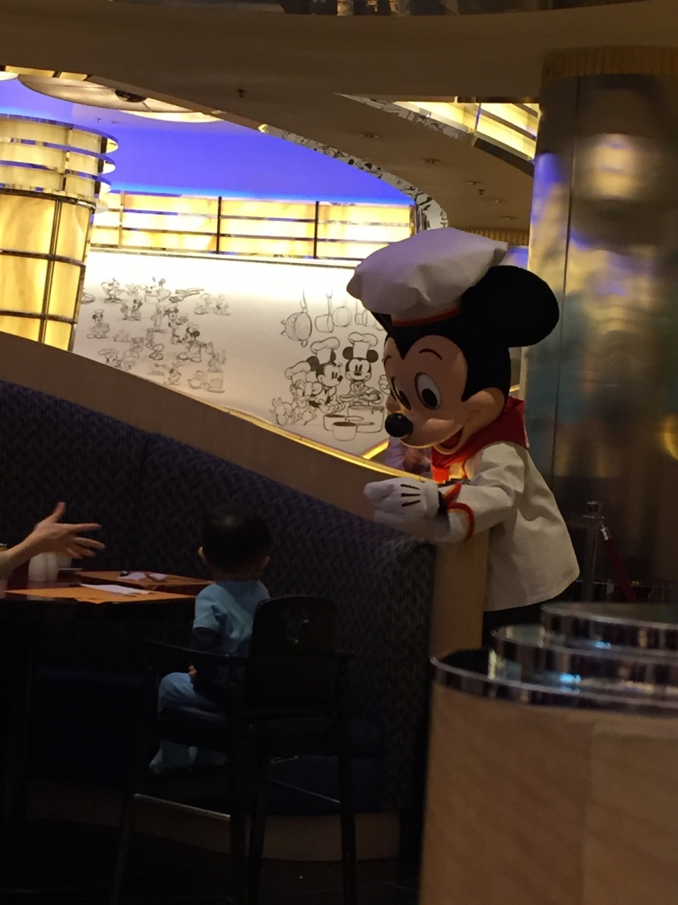8時になると音楽とともにシェフミッキーが登場します。みんなのテーブルの間を一瞬で通り過ぎ、フォトスポットでスタンバイ。