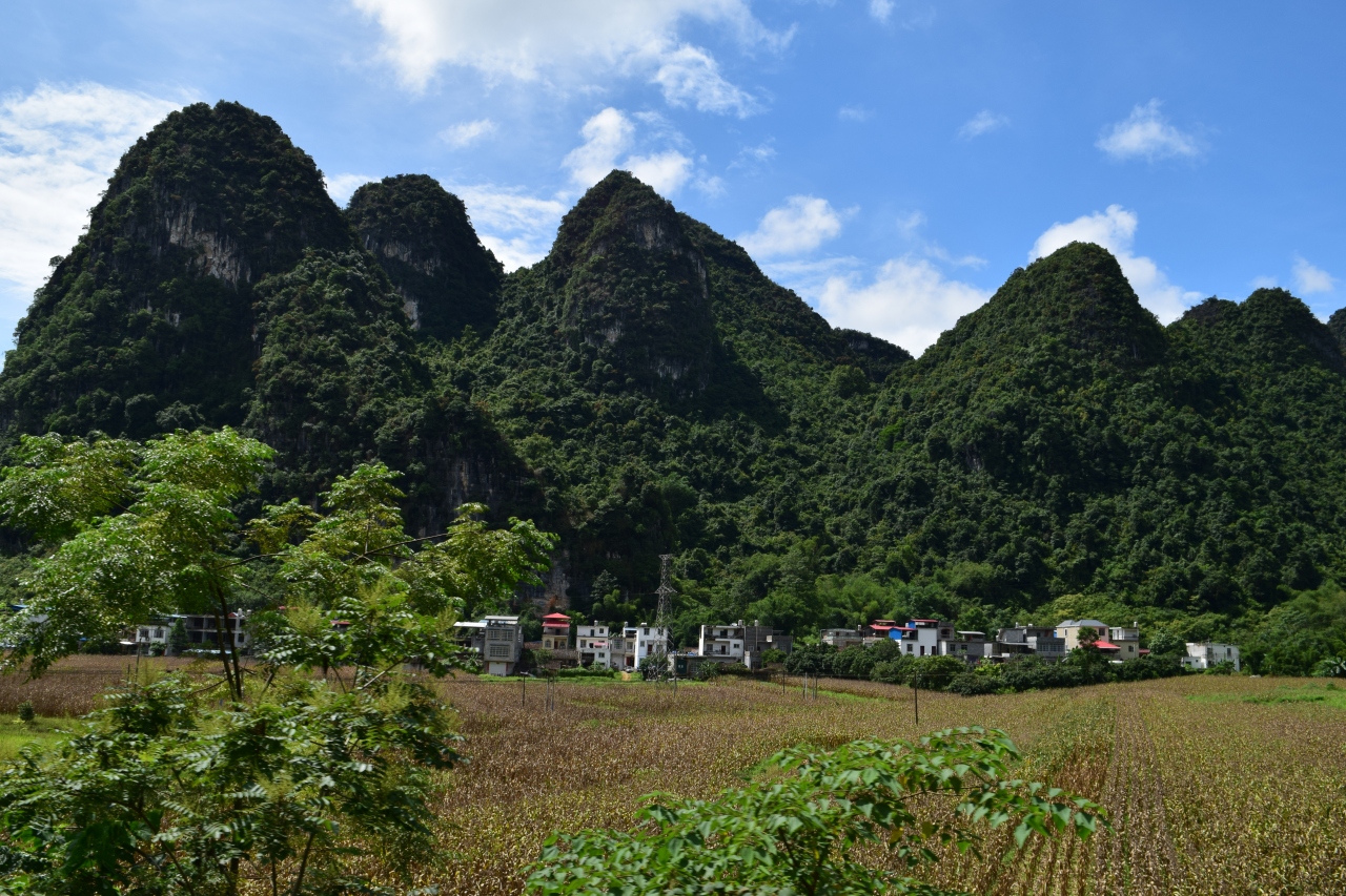 路中の風景にカルスト地形の妙を楽しみ、他地区のカルスト地形と成立の違いなどを考えた。このあたりは川が流れて地形が形成されたのがよく分かる土地柄で、平地部分はすべて果物やとうもろこしの畑であった。たいへん興味深い。
