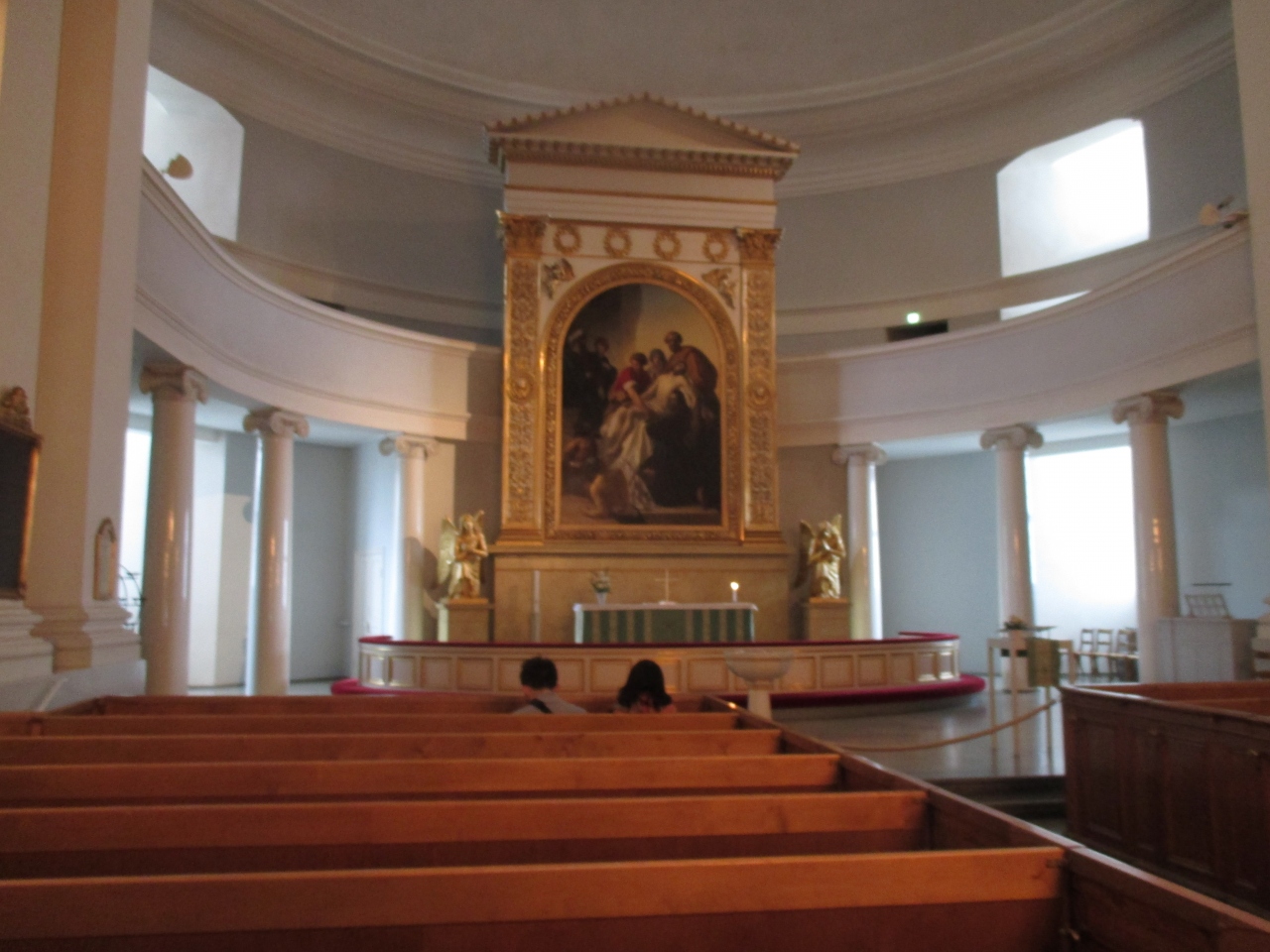 階段を上って入り口を入ると、両側にベンチが並ぶ中央通路をシャンデリアが照らしています。中央付近の右側の壁にマルティン・ルターの像があり、振り返って見上げると、パイプオルガンが入口の上の一面を覆っています。