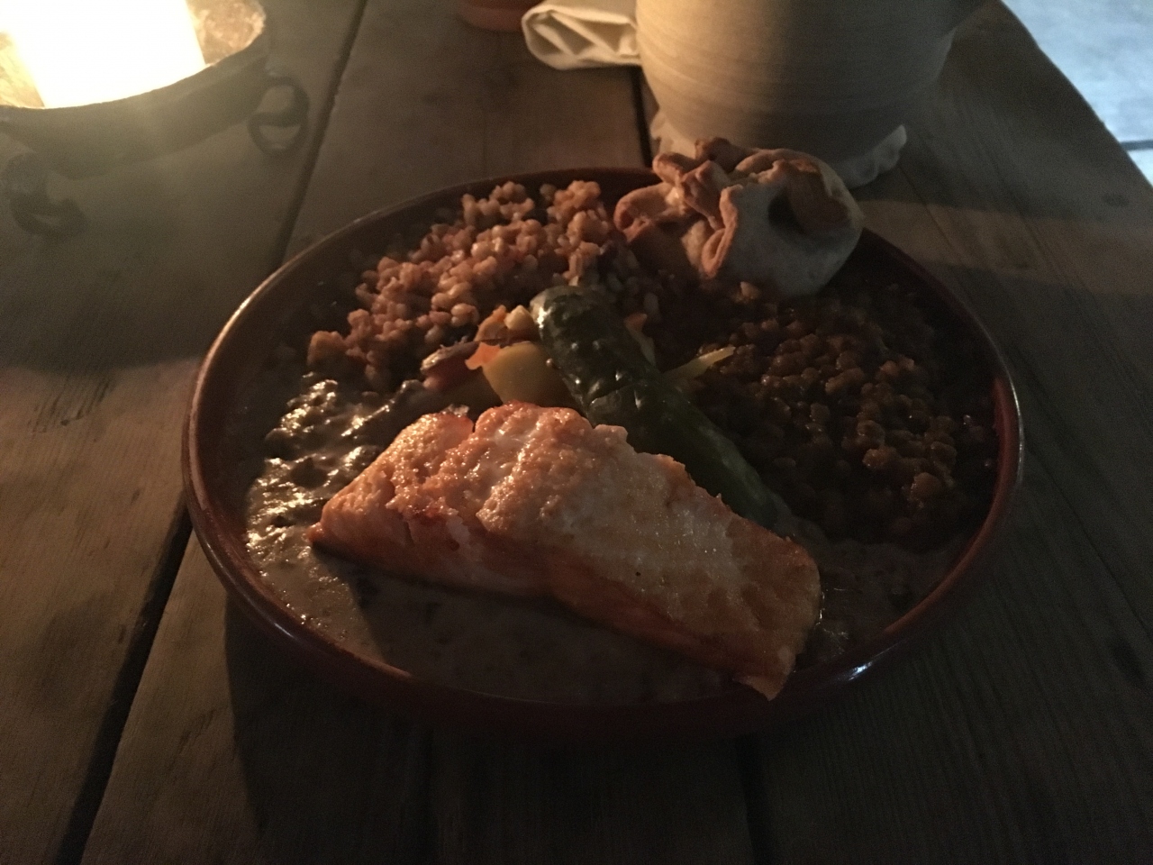 付け合わせには穀物や豆、ひき肉など。ひき肉の香辛料が強めだったので、終盤、少し胸焼けしました。