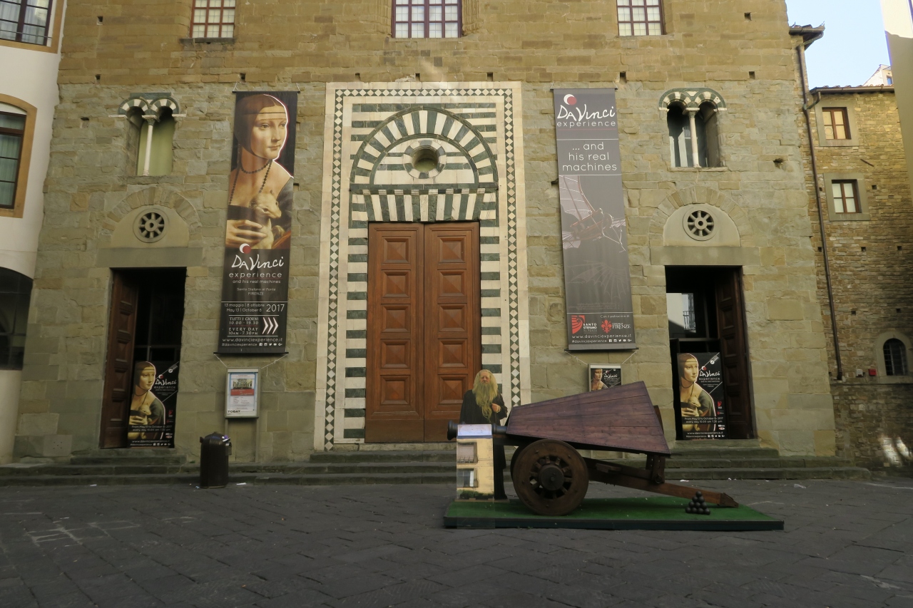 教会前には小さな広場があり、そこにはレオナルド・ダヴィンチの等身大のパネルと(たぶん)彼の発明品のひとつが置かれていました。