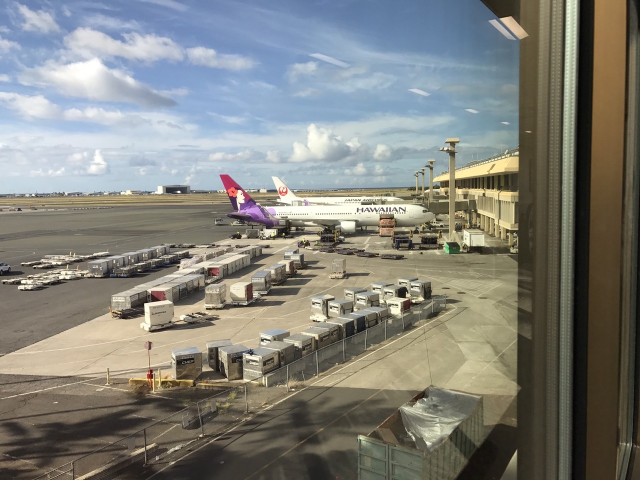 古さを感じさせる空港。帰国時の搭乗ゲートがA.B.C.Dあるうち中央搭乗ゲートB.Cは大混雑していた。少し離れているがA.D搭乗ゲートを使用することをオススメする。空港内で荷物を乗せるカートを使用するには5ドル必要。また空港内は窓のない場所が多く暑い。ワイキキで購入できるナッツやチョコレートがワイキキ価格の倍以上もした。空港での買い足しは極力避けるべき。