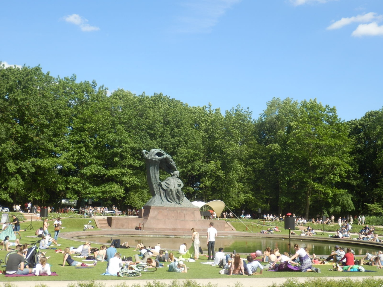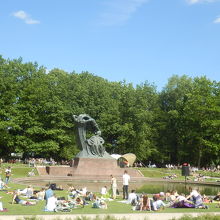 ワジェンキ公園の中央の入口を入ってすぐ、芝生広場の池の奥にあります。日曜日に開催される無料のピアノコンサートはこのショパン像の隣にピアノが置かれて開催されます。ピアノコンサートが開催される日は芝生広場に大勢の人が集まってきていました。コンサート終了後はバス停が大混雑していて、バスを数本見送る羽目になりました。
