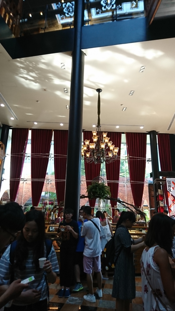 日本統治時代の1927年に宮原武熊医師が開院した「宮原眼科」であった歴史ある赤レンガの建物を、台中の銘菓を販売する「日出集団(DAWNCAKE)」がビルをリノベーションしたお店。今や台中を代表するスイーツ店として、台中で最も混雑する場所の一つ。日出は、パイナップルだけの餡のケーキで有名で、台北では売っていないパイナップルケーキやチーズケーキ、種類豊富なチョコレート、お茶などを販売。もちろん試食もできる。日本語のできる店員さんもおり、私が行ったときは、日本には毎年数回通うというお笑い好きの店員さんが、いろいろ勧めてくれました。チーズケーキが美味で、お土産にと思ったのですが、生ものなので危ないということであきらめてパイナップルケーキを購入。パイナップルケーキの餡はパイナップルだけで素材を生かしており甘さもちょうどよい。お店は、建物の特徴を生かすようにきれいにリノベーションされており、天井がガラス張りなので日中は日が入り暖かい雰囲気。歴史を感じます。店内は1Fはアイスクリーム、飲み物、お土産コーナー、2階にはサロン、3階は展示室、4階はVIPルームになっています。